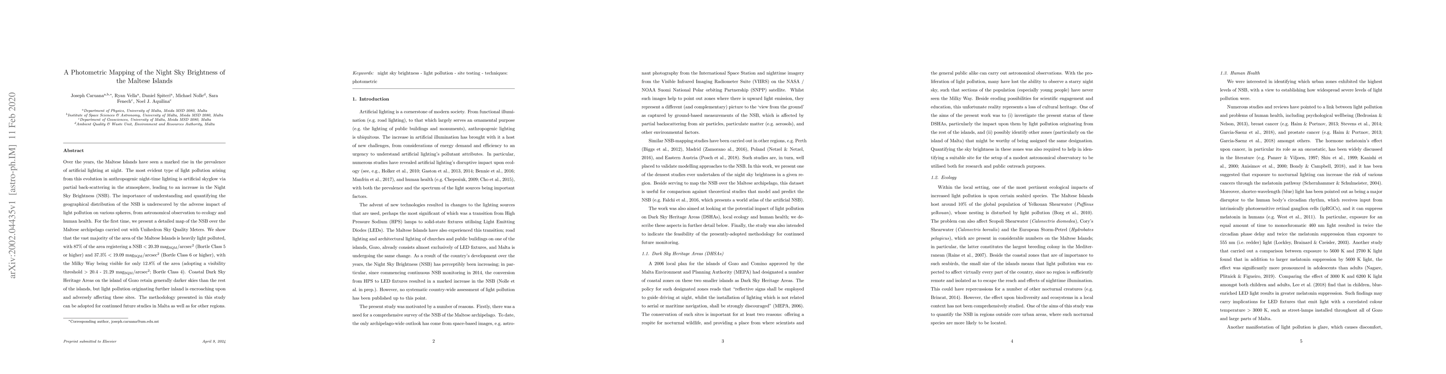 This study presents a detailed photometric mapping of night sky brightness over the Maltese Islands, revealing significant light pollution with 87% of the area classified as heavily polluted (Bortle Class 5 or higher). Coastal Dark Sky Heritage Areas on Gozo show relatively darker skies, but are still affected by inland light pollution.