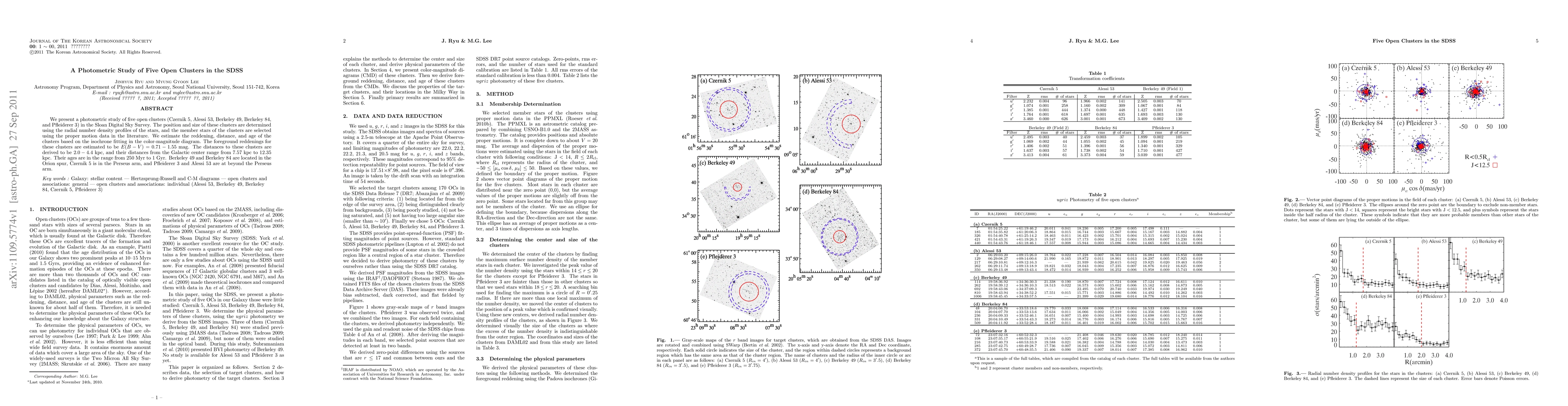 This study analyzes five open clusters using Sloan Digital Sky Survey data, determining their positions, sizes, and member stars through radial density profiles and proper motion data. The clusters' reddening, distances, and ages are estimated via isochrone fitting, revealing ages ranging from 250 Myr to 1 Gyr.