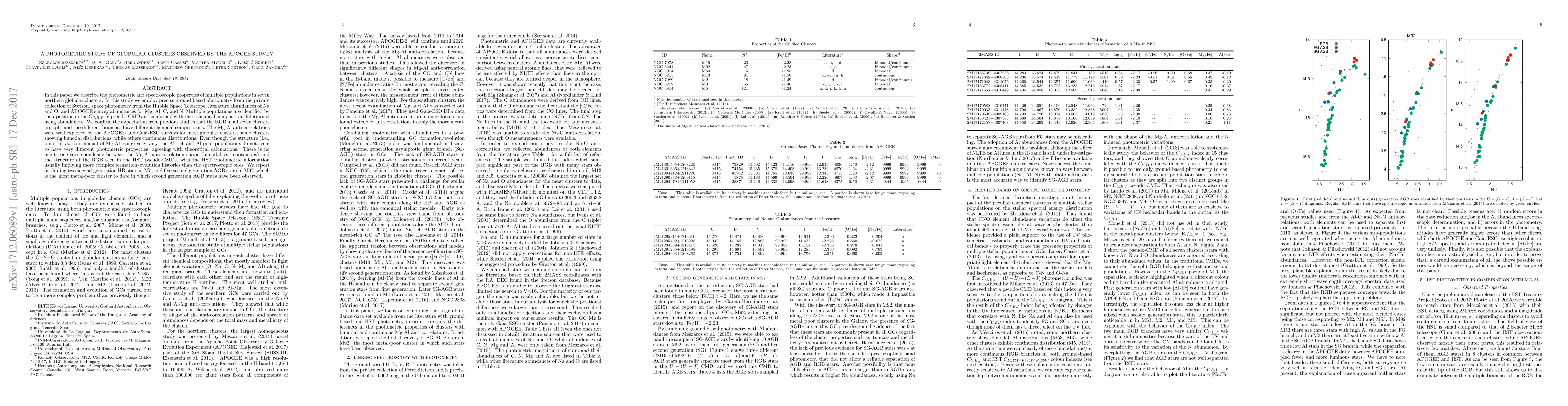 In this paper we describe the photometric and spectroscopic properties of multiple populations in seven northern globular clusters. In this study we employ precise ground based photometry from the private collection of Stetson, space photometry from the Hubble Space Telescope, literature abundances of Na and O, and APOGEE survey abundances for Mg, Al, C, and N. Multiple populations are identified by their position in the CU,B,I -V pseudo-CMD and confirmed with their chemical composition determined using abundances. We confirm the expectation from previous studies that the RGB in all seven clusters are split and the different branches have different chemical compositions. The Mg-Al anti-correlations were well explored by the APOGEE and Gaia-ESO surveys for most globular clusters, some clusters showing bimodal distributions, while others continuous distributions. Even though the structure (i.e., bimodal vs. continuous) of Mg-Al can greatly vary, the Al-rich and Al-poor populations do not seem to have very different photometric properties, agreeing with theoretical calculations. There is no one-to-one correspondence between the Mg-Al anticorrelation shape (bimodal vs. continuous) and the structure of the RGB seen in the HST pseudo-CMDs, with the HST photometric information usually implying more complex formation/evolution histories than the spectroscopic ones. We report on finding two second generation HB stars in M5, and five second generation AGB stars in M92, which is the most metal-poor cluster to date in which second generation AGB stars have been observed.