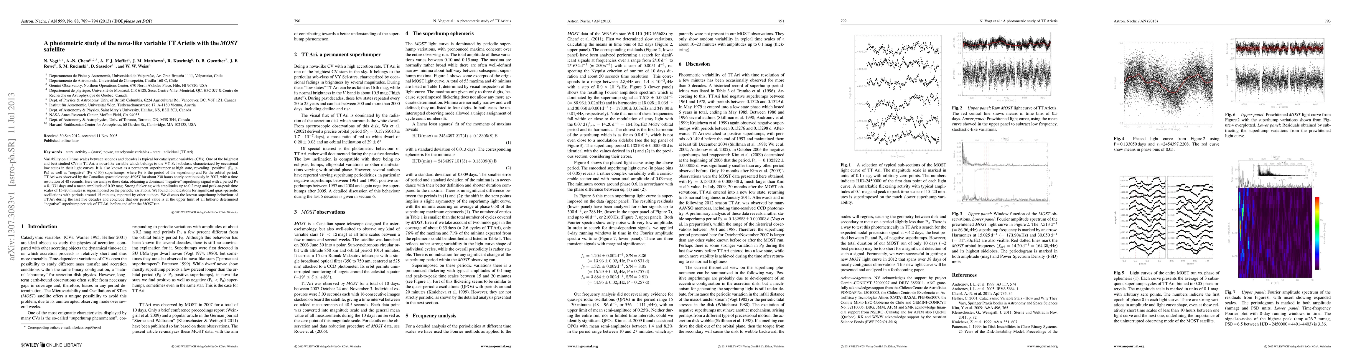 Variability on all time scales between seconds and decades is typical for cataclysmic variables (CVs). One of the brightest and best studied CVs is TT Ari, a nova-like variable which belongs to the VY Scl subclass, characterized by occasional low states in their light curves. It is also known as a permanent superhumper at high state, revealing "positive" (P_S > P_0) as well as "negative" (P_S < P_0) superhumps, where P_S is the period of the superhump and P_0 the orbital period. TT Ari was observed by the Canadian space telescope MOST for about 230 hours nearly continuously in 2007, with a time resolution of 48 seconds. Here we analyze these data, obtaining a dominant "negative" superhump signal with a period P_S = 0.1331 days and a mean amplitude of 0.09 mag. Strong flickering with amplitudes up to 0.2 mag and peak-to-peak time scales of 15-20 minutes is superimposed on the periodic variations. We found no indications for significant quasi-periodic oscillations with periods around 15 minutes, reported by other authors. We discuss the known superhump behaviour of TT Ari during the last five decades and conclude that our period value is at the upper limit of all hitherto determined "negative" superhump periods of TT Ari, before and after the MOST run.