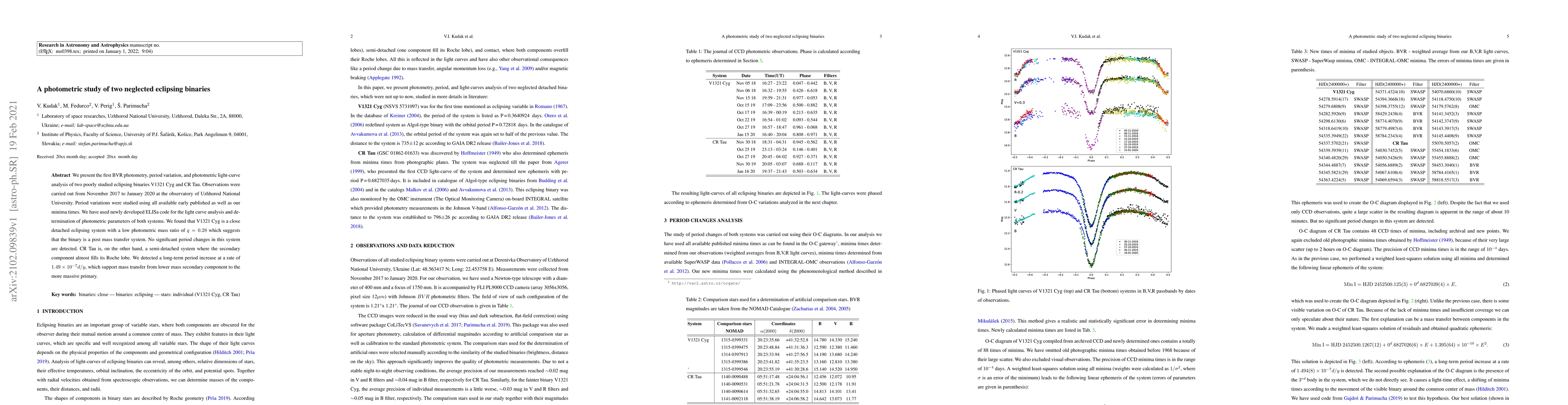 The research presents the first BVR photometry, period variation study, and light-curve analysis of two neglected eclipsing binaries, V1321 Cyg and CR Tau, using observations from November 2017 to January 2020 at the Uzhhorod National University observatory. The ELISa code was employed for light curve analysis and determination of photometric parameters.