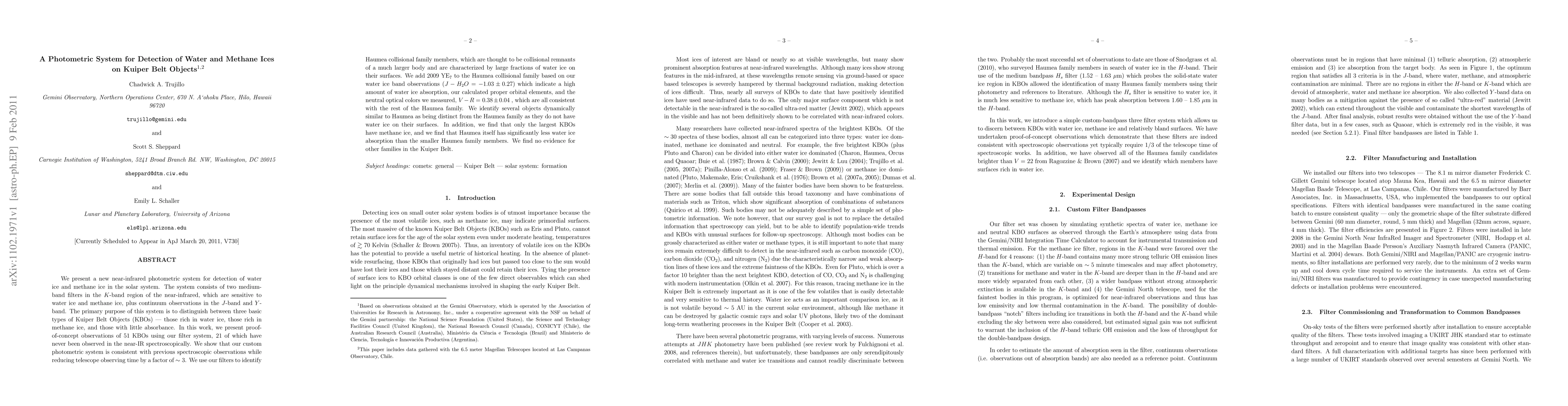 We present a new near-infrared photometric system for detection of water ice and methane ice in the solar system. The system consists of two medium-band filters in the K-band region of the near-infrared, which are sensitive to water ice and methane ice, plus continuum observations in the J-band and Y-band. The primary purpose of this system is to distinguish between three basic types of Kuiper Belt Objects (KBOs) --- those rich in water ice, those rich in methane ice, and those with little absorbance. In this work, we present proof-of-concept observations of 51 KBOs using our filter system, 21 of which have never been observed in the near-IR spectroscopically. We show that our custom photometric system is consistent with previous spectroscopic observations while reducing telescope observing time by a factor of 3. We use our filters to identify Haumea collisional family members, which are thought to be collisional remnants of a much larger body and are characterized by large fractions of water ice on their surfaces. We add 2009 YE7 to the Haumea collisional family based on our water ice band observations(J-H2O = -1.03 +/- 0.27) which indicate a high amount of water ice absorption, our calculated proper orbital elements, and the neutral optical colors we measured, V-R = 0.38 +/- 0.04, which are all consistent with the rest of the Haumea family. We identify several objects dynamically similar to Haumea as being distinct from the Haumea family as they do not have water ice on their surfaces. In addition, we find that only the largest KBOs have methane ice, and we find that Haumea itself has significantly less water ice absorption than the smaller Haumea family members. We find no evidence for other families in the Kuiper Belt.