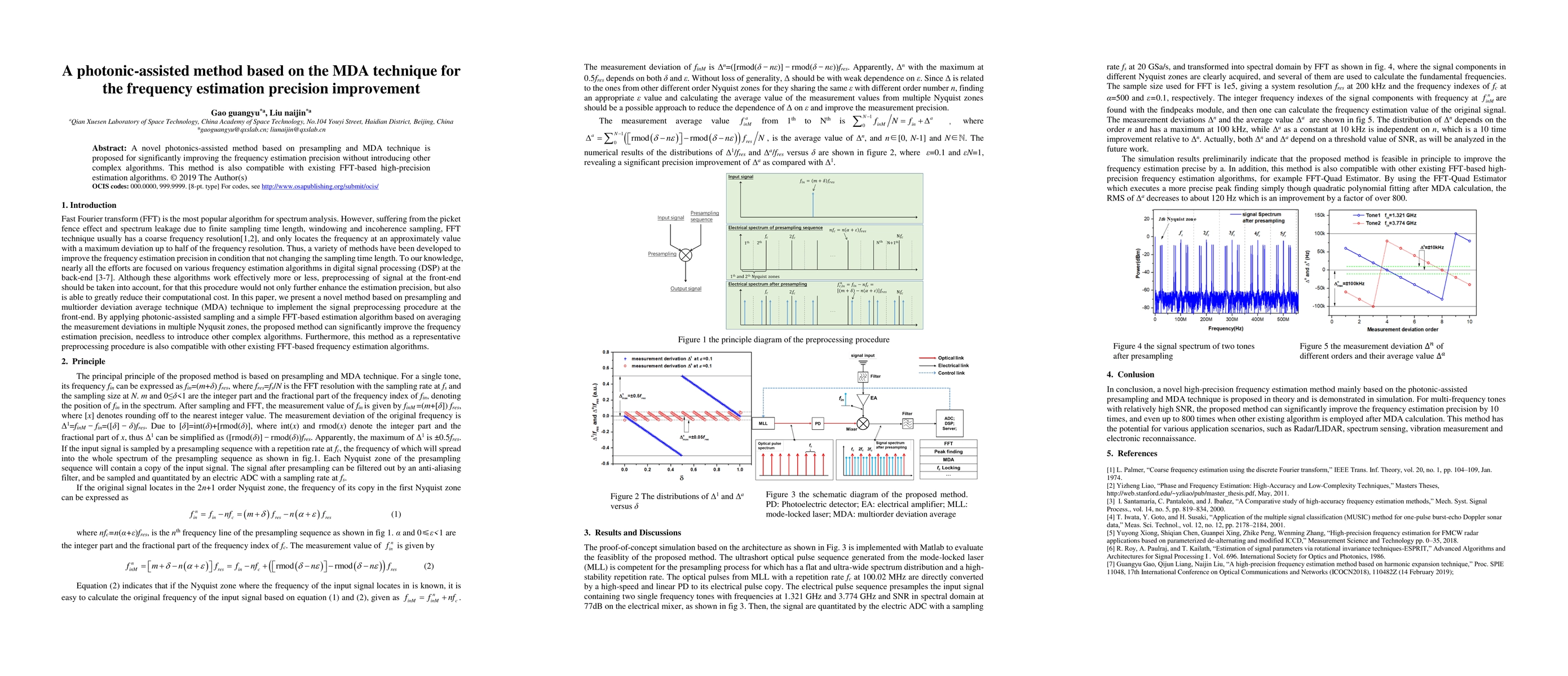 A novel photonics-assisted method based on presampling and MDA technique is proposed for significantly improving the frequency estimation precision without introducing other complex algorithms. This method is also compatible with existing FFT-based high-precision estimation algorithms