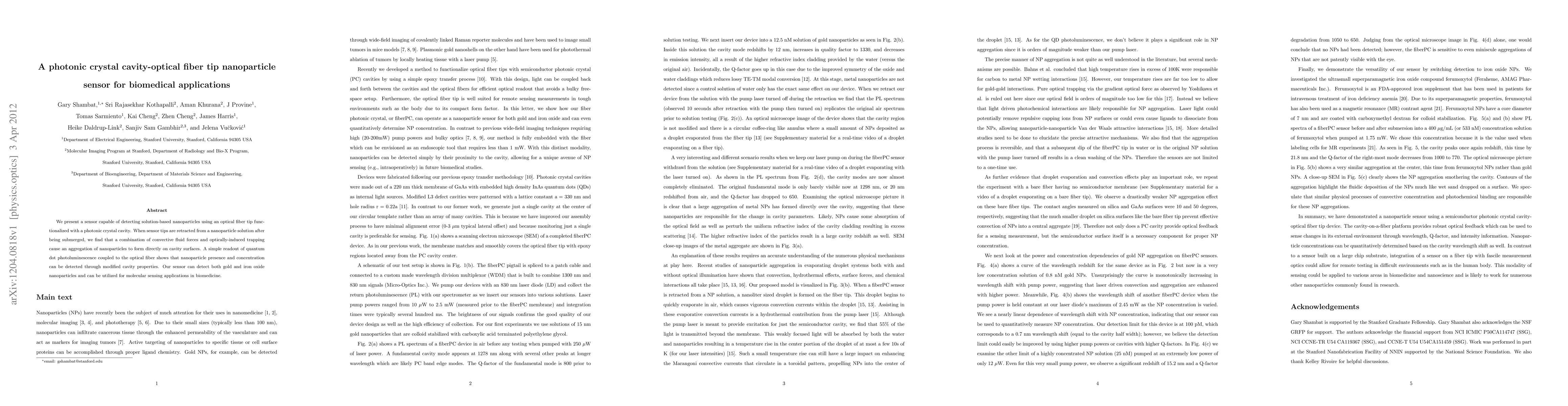 This paper introduces a photonic crystal cavity-optical fiber tip sensor for detecting nanoparticles, showing that aggregated nanoparticles on cavity surfaces alter the sensor's quantum dot photoluminescence, enabling detection of gold and iron oxide nanoparticles for biomedical molecular sensing.