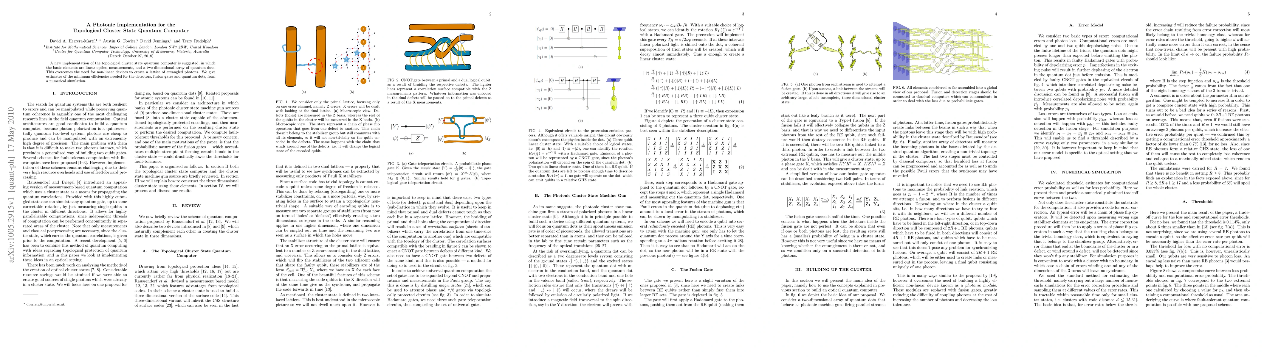 This paper proposes a photonic implementation for a topological cluster state quantum computer using linear optics and a two-dimensional array of quantum dots, eliminating the need for non-linear devices. Numerical simulations provide estimates of the required efficiencies for detectors, fusion gates, and quantum dots.