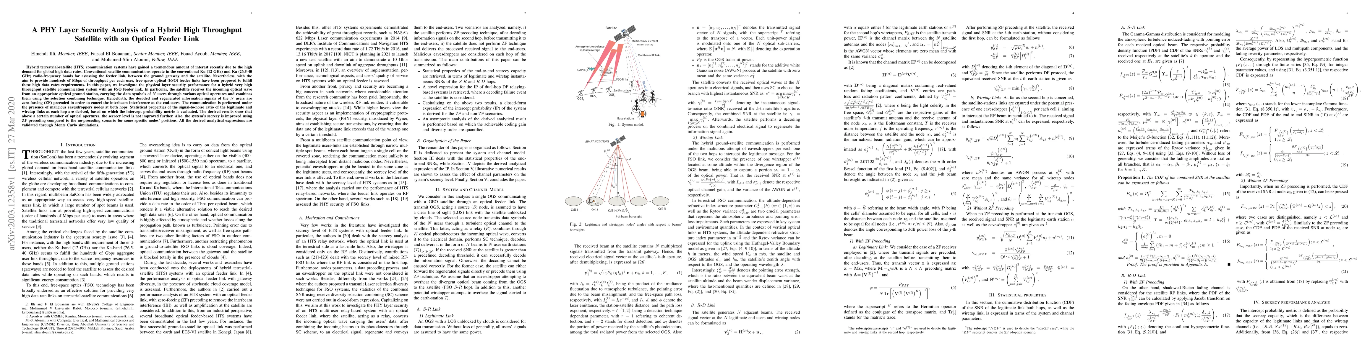 Hybrid terrestrial-satellite (HTS) communication systems have gained a tremendous amount of interest recently due to the high demand for global high data rates. Conventional satellite communications operate in the conventional Ku (12 GHz) and Ka (26.5-40 GHz) radio-frequency bands for assessing the feeder link, between the ground gateway and the satellite. Nevertheless, with the aim to provide hundreds of Mbps of throughput per each user, free-space optical (FSO) feeder links have been proposed to fulfill these high data rates requirements. In this paper, we investigate the physical layer security performance for a hybrid very high throughput satellite communication system with an FSO feeder link. In particular, the satellite receives the incoming optical wave from an appropriate optical ground station, carrying the data symbols of $N$ users through various optical apertures and combines them using the selection combining technique. Henceforth, the decoded and regenerated information signals of the $N$ users are zero-forcing (ZF) precoded in order to cancel the interbeam interference at the end-users. The communication is performed under the presence of malicious eavesdroppers nodes at both hops. Statistical properties of the signal-to-noise ratio of the legitimate and wiretap links at each hop are derived, based on which the intercept probability metric is evaluated. The derived results show that above a certain number of optical apertures, the secrecy level is not improved further. Also, the system's secrecy is improved using ZF precoding compared to the no-precoding scenario for some specific nodes' positions. All the derived analytical expressions are validated through Monte Carlo simulations.