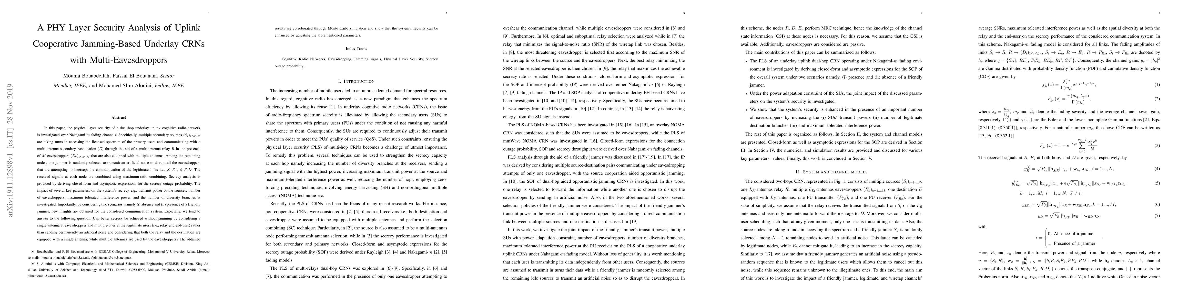 In this paper, the physical layer security of a dual-hop underlay uplink cognitive radio network is investigated over Nakagami-m fading channels. Specifically, multiple secondary sources are taking turns in accessing the licensed spectrum of the primary users and communicating with a multiantenna secondary base station D through the aid of a multiantenna relay R in the presence of M eavesdroppers that are also equipped with multiple antennas. Among the remaining nodes, one jammer is randomly selected to transmit an artificial noise to disrupt all the eavesdroppers that are attempting to intercept the communication of the legitimate links i.e., S-R and R-D. The received signals at each node are combined using maximal-ratio combining. Secrecy analysis is provided by deriving closed-form and asymptotic expressions for the secrecy outage probability. The impact of several key parameters on the system's secrecy e.g., transmit power of the sources, number of eavesdroppers, maximum tolerated interference power, and the number of diversity branches is investigated. Importantly, by considering two scenarios, namely (i) absence and (ii) presence of a friendly jammer, new insights are obtained for the considered communication system. Especially, we tend to answer to the following question: Can better secrecy be achieved without jamming by considering a single antenna at eavesdroppers and multiple-ones at the legitimate users (i.e., relay and end-user) rather than sending permanently an artificial noise and considering that both the relay and the destination are equipped with a single antenna, while multiple antennas are used by the eavesdroppers? The obtained results are corroborated through Monte Carlo simulation and show that the system's security can be enhanced by adjusting the aforementioned parameters.