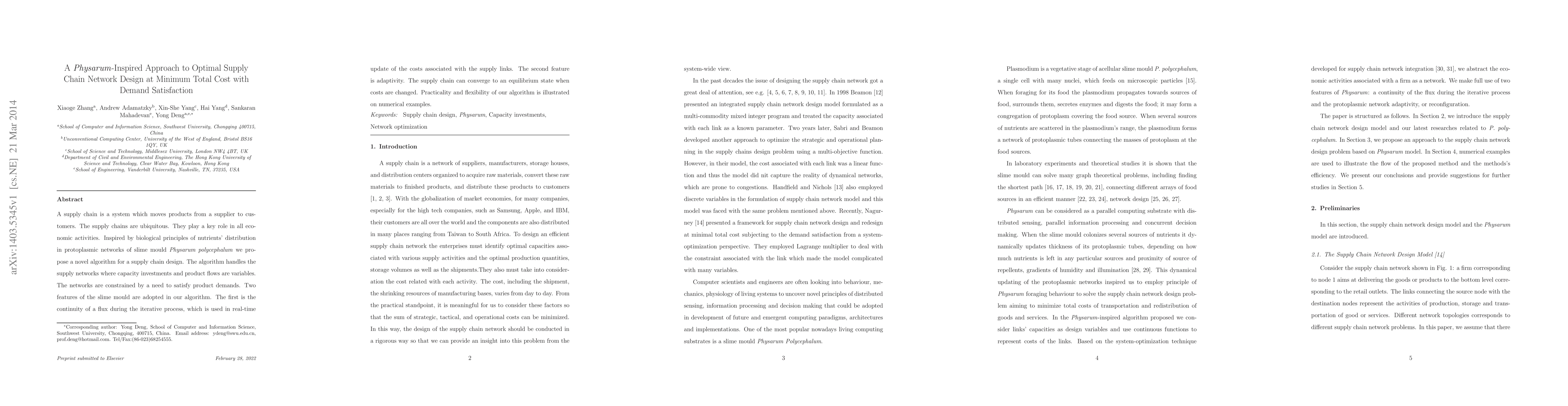 This research introduces a novel supply chain network design algorithm inspired by the foraging behavior of slime mold Physarum polycephalum. The algorithm ensures minimum total cost while satisfying demand, maintaining flux continuity for real-time cost updates and demonstrating adaptability to cost changes, as validated through numerical examples.