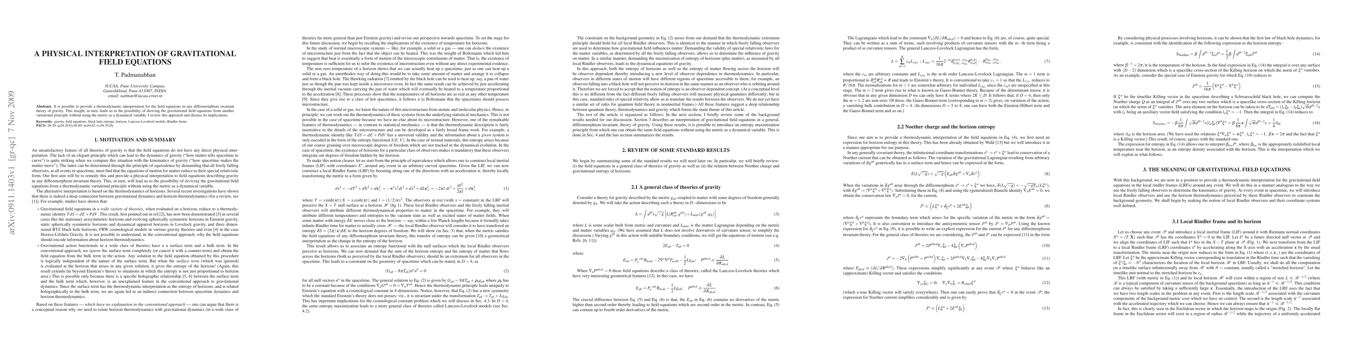 It is possible to provide a thermodynamic interpretation for the field equations in any diffeomorphism invariant theory of gravity. This insight, in turn, leads us to the possibility of deriving the gravitational field equations from another variational principle without using the metric as a dynamical variable. I review this approach and discuss its implications.