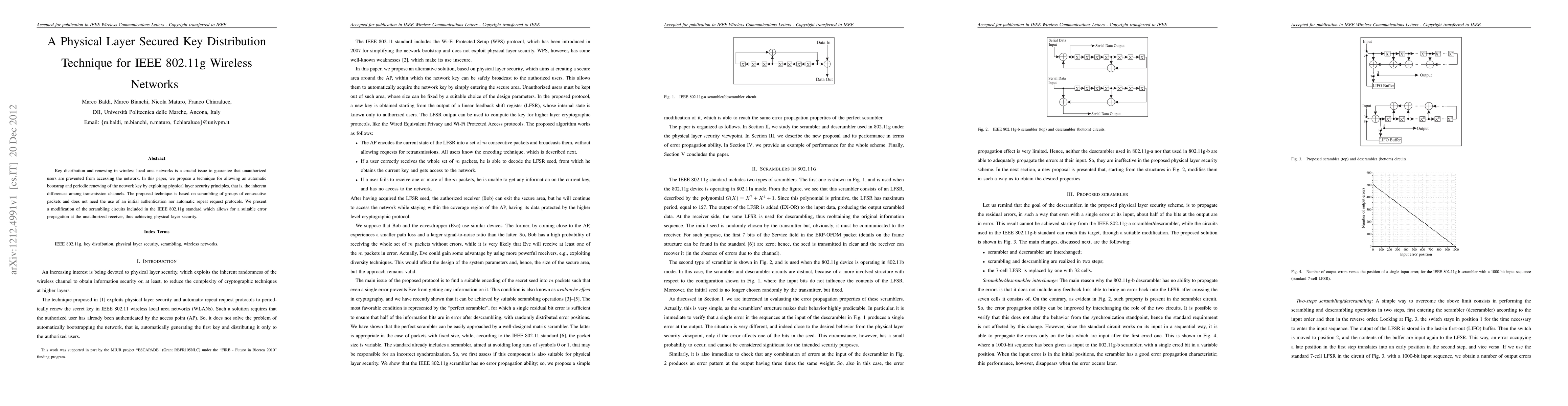 Key distribution and renewing in wireless local area networks is a crucial issue to guarantee that unauthorized users are prevented from accessing the network. In this paper, we propose a technique for allowing an automatic bootstrap and periodic renewing of the network key by exploiting physical layer security principles, that is, the inherent differences among transmission channels. The proposed technique is based on scrambling of groups of consecutive packets and does not need the use of an initial authentication nor automatic repeat request protocols. We present a modification of the scrambling circuits included in the IEEE 802.11g standard which allows for a suitable error propagation at the unauthorized receiver, thus achieving physical layer security.