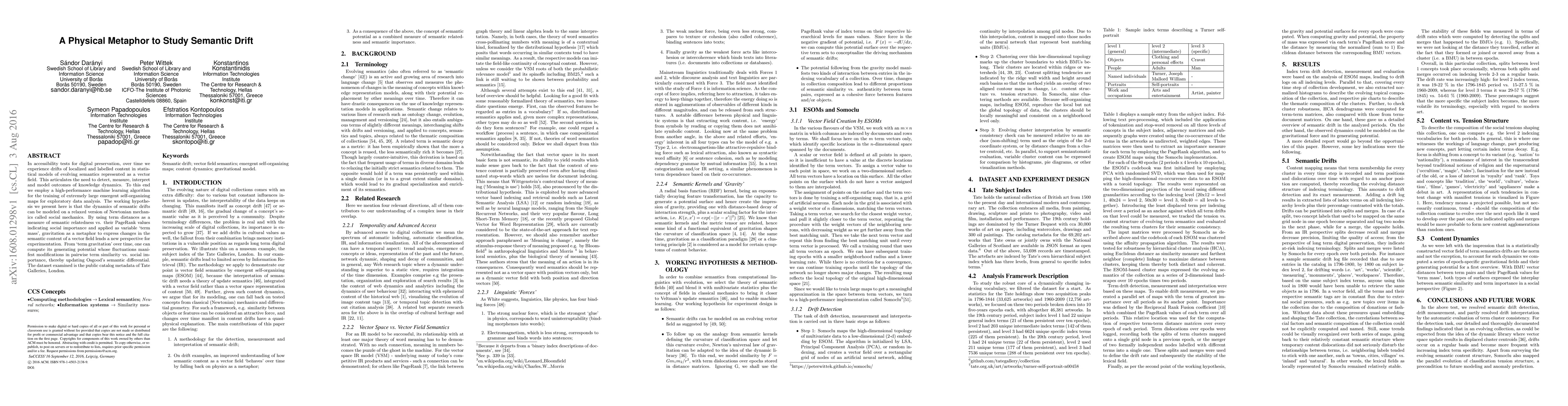In accessibility tests for digital preservation, over time we experience drifts of localized and labelled content in statistical models of evolving semantics represented as a vector field. This articulates the need to detect, measure, interpret and model outcomes of knowledge dynamics. To this end we employ a high-performance machine learning algorithm for the training of extremely large emergent self-organizing maps for exploratory data analysis. The working hypothesis we present here is that the dynamics of semantic drifts can be modeled on a relaxed version of Newtonian mechanics called social mechanics. By using term distances as a measure of semantic relatedness vs. their PageRank values indicating social importance and applied as variable `term mass', gravitation as a metaphor to express changes in the semantic content of a vector field lends a new perspective for experimentation. From `term gravitation' over time, one can compute its generating potential whose fluctuations manifest modifications in pairwise term similarity vs. social importance, thereby updating Osgood's semantic differential. The dataset examined is the public catalog metadata of Tate Galleries, London.