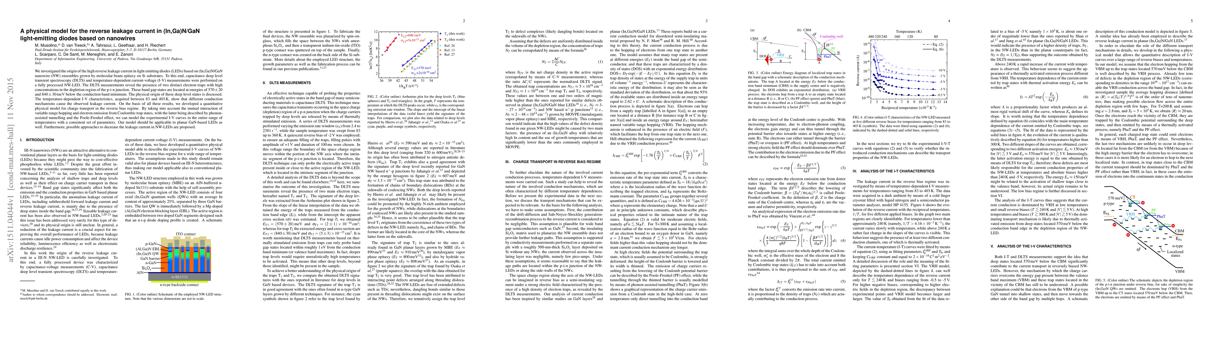 This paper investigates the high reverse leakage current in (In,Ga)N/GaN nanowire LED devices using DLTS and I-V measurements. It identifies two electron traps in the p-i-n junction and develops a physical model incorporating variable range hopping and phonon-assisted tunnelling to explain the leakage current, applicable to both nanowire and planar GaN LEDs.