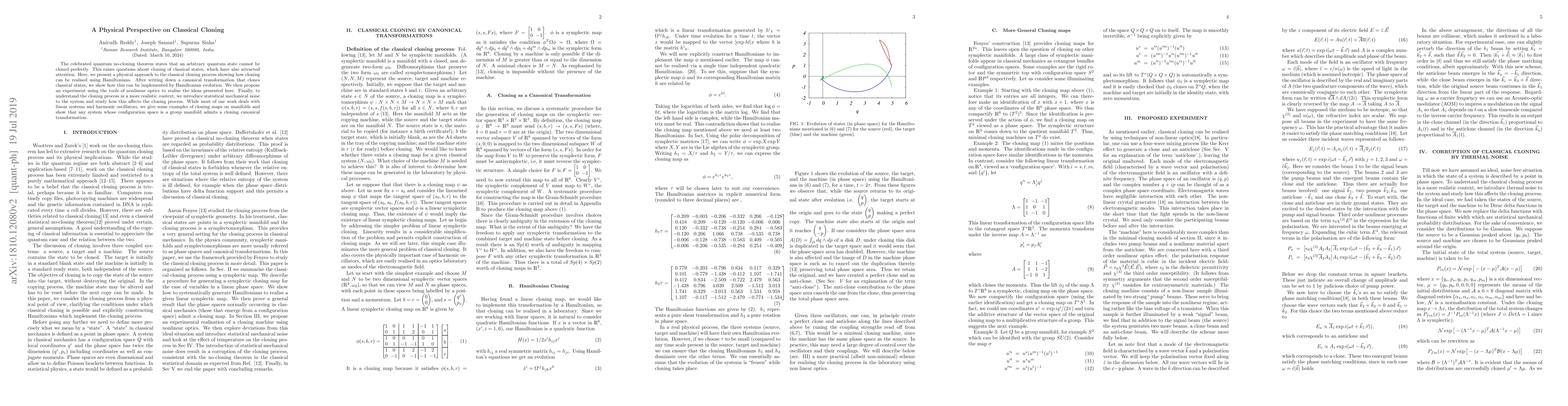This paper explores classical state cloning from a physical perspective, demonstrating how it can be achieved using Hamiltonian evolution and canonical transformations. It proposes an experiment in nonlinear optics to implement these ideas and examines the effects of statistical mechanical noise on the cloning process.