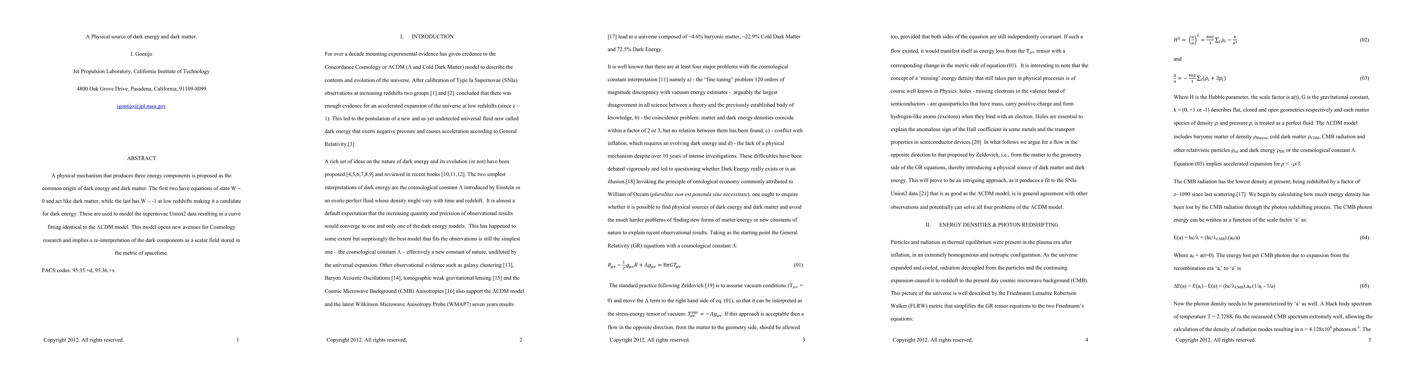 This paper proposes a physical mechanism generating three energy components that serve as the common origin for dark energy and dark matter, fitting supernovae data equivalently to the ΛCDM model and suggesting a scalar field interpretation of these dark components.