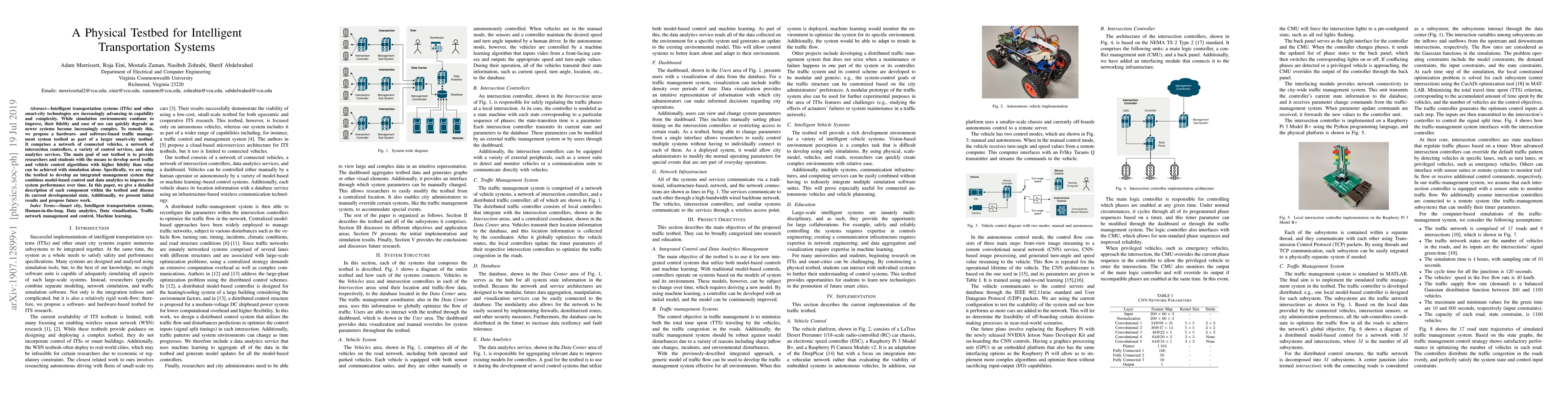 Intelligent transportation systems (ITSs) and other smart-city technologies are increasingly advancing in capability and complexity. While simulation environments continue to improve, their fidelity and ease of use can quickly degrade as newer systems become increasingly complex. To remedy this, we propose a hardware- and software-based traffic management system testbed as part of a larger smart-city testbed. It comprises a network of connected vehicles, a network of intersection controllers, a variety of control services, and data analytics services. The main goal of our testbed is to provide researchers and students with the means to develop novel traffic and vehicle control algorithms with higher fidelity than what can be achieved with simulation alone. Specifically, we are using the testbed to develop an integrated management system that combines model-based control and data analytics to improve the system performance over time. In this paper, we give a detailed description of each component within the testbed and discuss its current developmental state. Additionally, we present initial results and propose future work. Index Terms: Smart city, Intelligent transportation systems, Human-in-the-loop, Data analytics, Data visualization, Traffic network management and control, Machine learning.