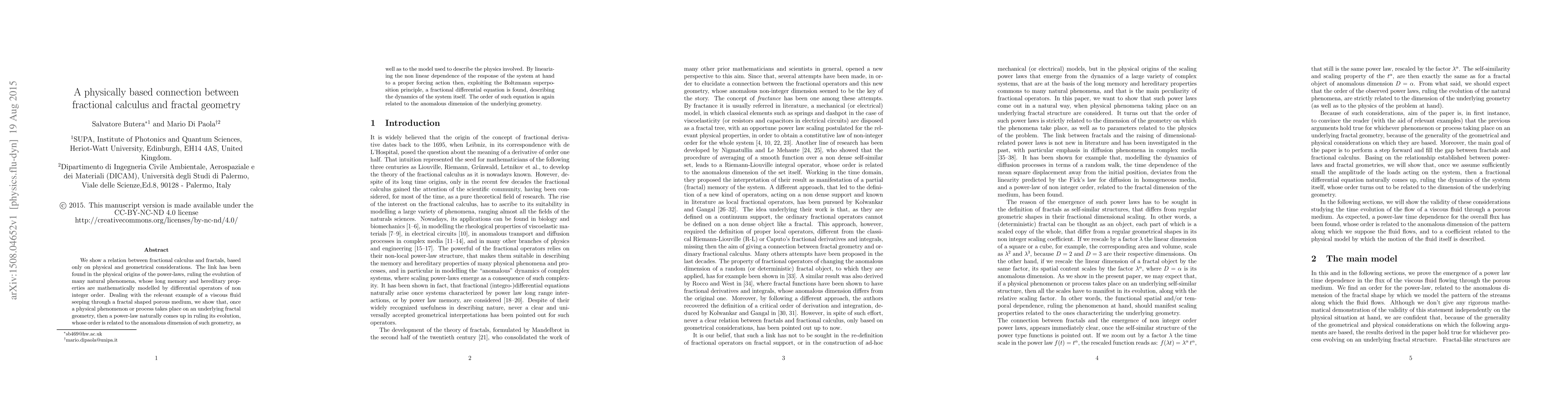 This paper establishes a connection between fractional calculus and fractal geometry through physical and geometrical reasoning, demonstrating that power-laws governing natural phenomena arise from fractal-shaped porous media, with the order of fractional differential equations tied to the anomalous dimension of the fractal geometry.