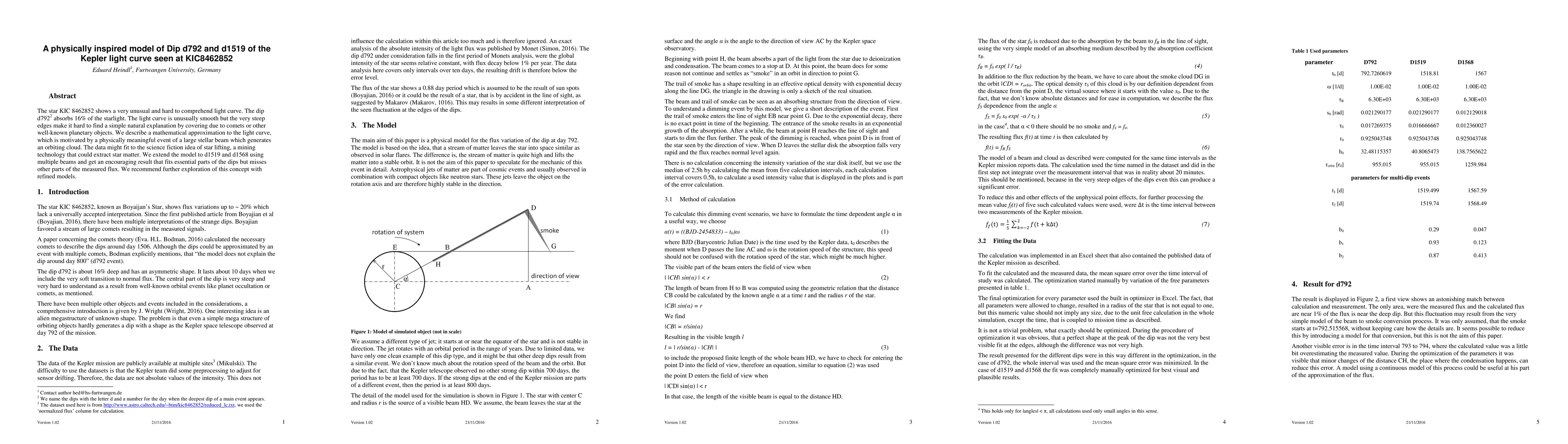 The research proposes a mathematical model, inspired by a stellar beam generating an orbiting cloud, to explain the unusual light curve dips (d792 and d1519) of star KIC8462852. The model suggests a 'star lifting' process, a hypothetical mining technology extracting star matter. While the model fits essential parts of the dips, it misses others, thus the authors recommend further exploration with refined models.