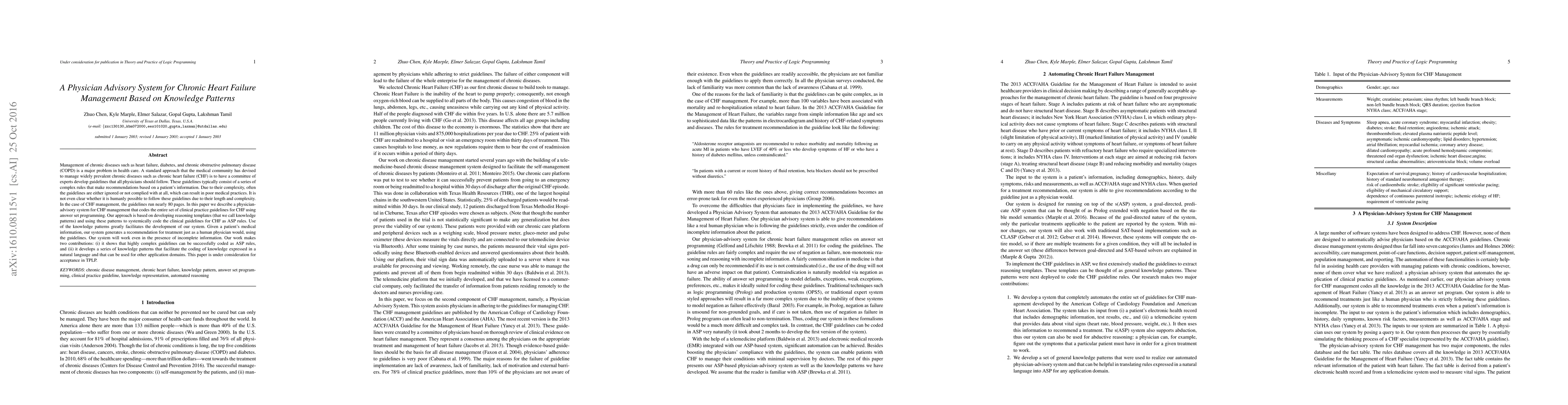 This paper proposes a physician advisory system for chronic heart failure management that utilizes answer set programming to encode complex clinical guidelines into reasoning templates called knowledge patterns. The system generates treatment recommendations based on patient data, even with incomplete information, demonstrating the potential for complex guidelines to be effectively codified and used in practice.