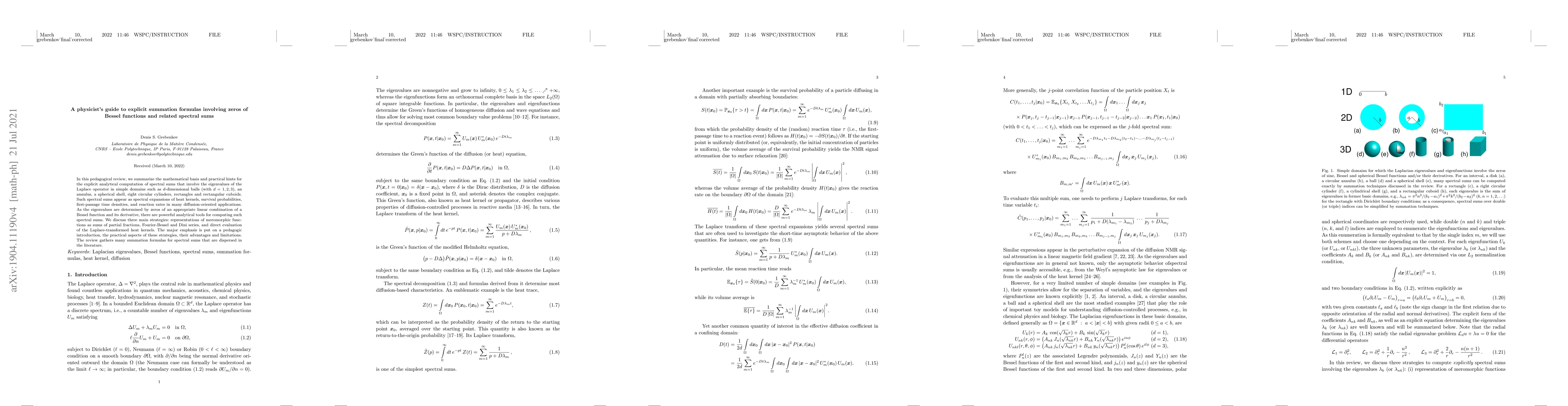 We summarize the mathematical basis and practical hints for the explicit analytical computation of spectral sums that involve the eigenvalues of the Laplace operator in simple domains. Such spectral sums appear as spectral expansions of heat kernels, survival probabilities, first-passage time densities, and reaction rates in many diffusion-oriented applications. As the eigenvalues are determined by zeros of an appropriate linear combination of a Bessel function and its derivative, there are powerful analytical tools for computing such spectral sums. We discuss three main strategies: representations of meromorphic functions as sums of partial fractions, Fourier-Bessel and Dini series, and direct evaluation of the Laplace-transformed heat kernels. The major emphasis is put on a pedagogic introduction, the practical aspects of these strategies, their advantages and limitations. The review summarizes many summation formulas for spectral sums that are dispersed in the literature.