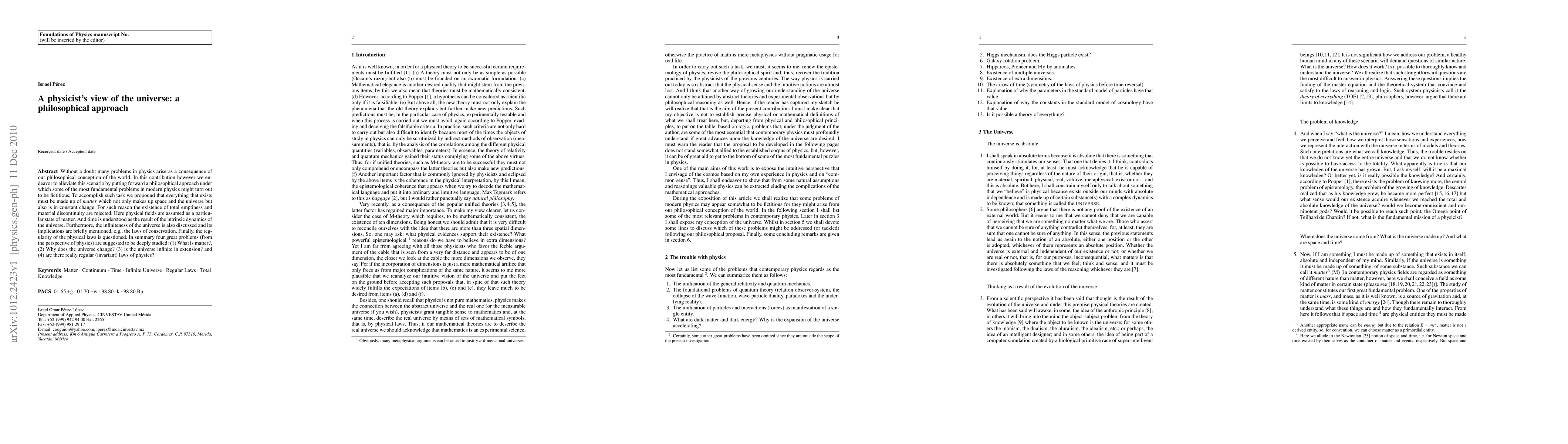 This paper proposes a philosophical approach to address fundamental problems in modern physics by redefining matter as the constant, dynamic essence of the universe, rejecting total emptiness and material discontinuity, and questioning the regularity of physical laws. It explores the implications of an infinite universe and the nature of time as intrinsic dynamics.