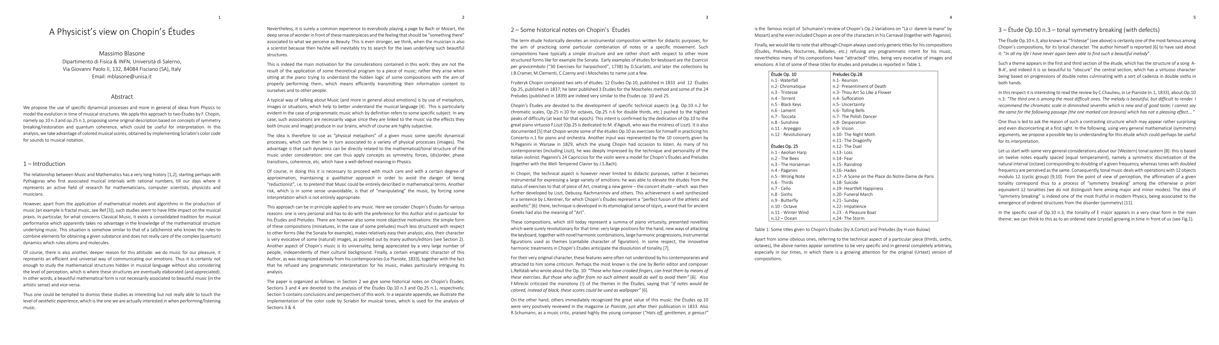 This paper applies physical concepts like symmetry breaking/restoration and quantum coherence to model Chopin's Etudes op.10 n.3 and op.25 n.1, using colored musical scores based on Scriabin's color code for interpretation. The approach aims to provide novel insights into the musical structures' temporal evolution.
