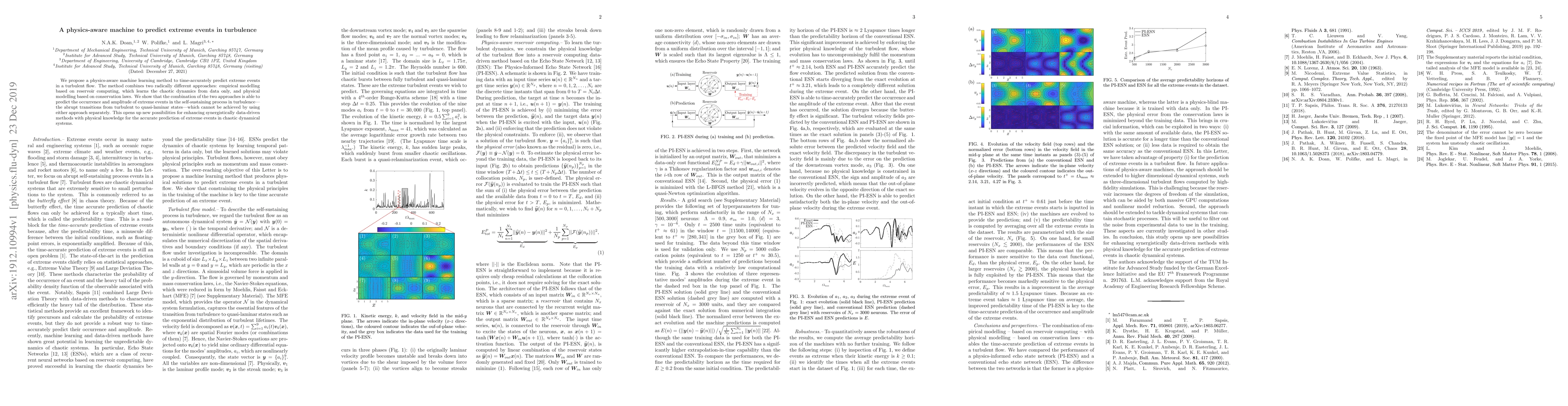 This paper introduces a physics-aware machine learning method that combines empirical reservoir computing with physical modelling based on conservation laws to predict extreme events in turbulent flow. The hybrid approach outperforms individual methods, offering improved accuracy in forecasting abrupt transitions in turbulence.