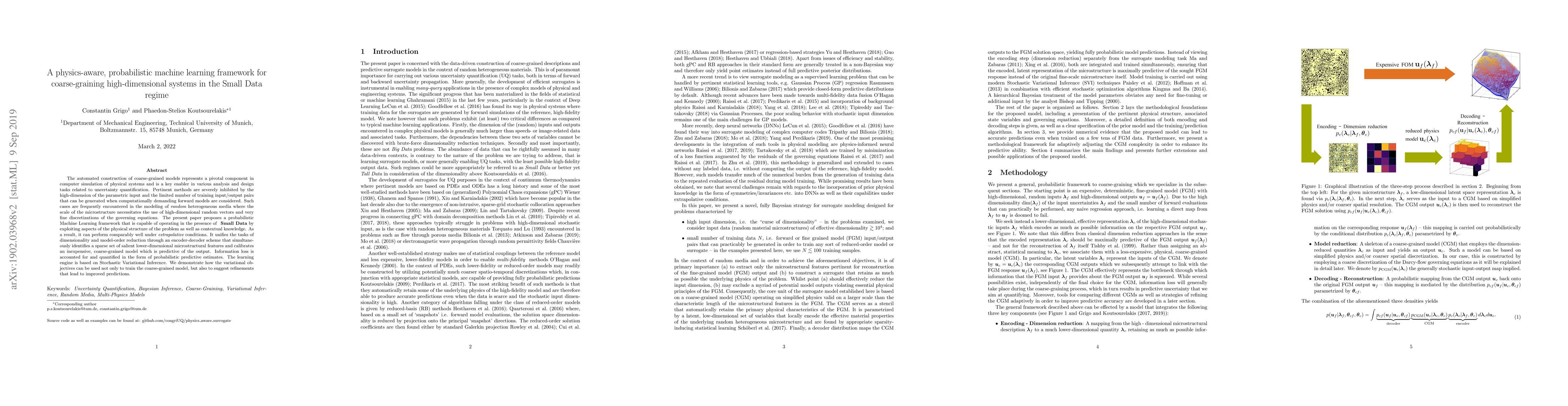 The automated construction of coarse-grained models represents a pivotal component in computer simulation of physical systems and is a key enabler in various analysis and design tasks related to uncertainty quantification. Pertinent methods are severely inhibited by the high-dimension of the parametric input and the limited number of training input/output pairs that can be generated when computationally demanding forward models are considered. Such cases are frequently encountered in the modeling of random heterogeneous media where the scale of the microstructure necessitates the use of high-dimensional random vectors and very fine discretizations of the governing equations. The present paper proposes a probabilistic Machine Learning framework that is capable of operating in the presence of Small Data by exploiting aspects of the physical structure of the problem as well as contextual knowledge. As a result, it can perform comparably well under extrapolative conditions. It unifies the tasks of dimensionality and model-order reduction through an encoder-decoder scheme that simultaneously identifies a sparse set of salient lower-dimensional microstructural features and calibrates an inexpensive, coarse-grained model which is predictive of the output. Information loss is accounted for and quantified in the form of probabilistic predictive estimates. The learning engine is based on Stochastic Variational Inference. We demonstrate how the variational objectives can be used not only to train the coarse-grained model, but also to suggest refinements that lead to improved predictions.