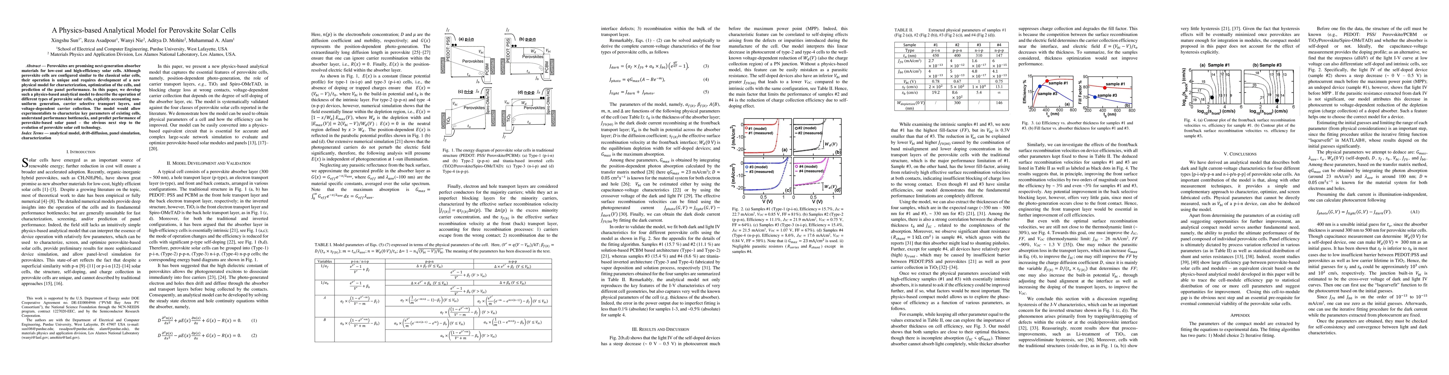 This paper develops a physics-based analytical model to characterize the operation of perovskite solar cells, accounting for non-uniform generation and voltage-dependent carrier collection. The model aids in understanding performance bottlenecks and predicting the efficiency of perovskite-based solar panels.