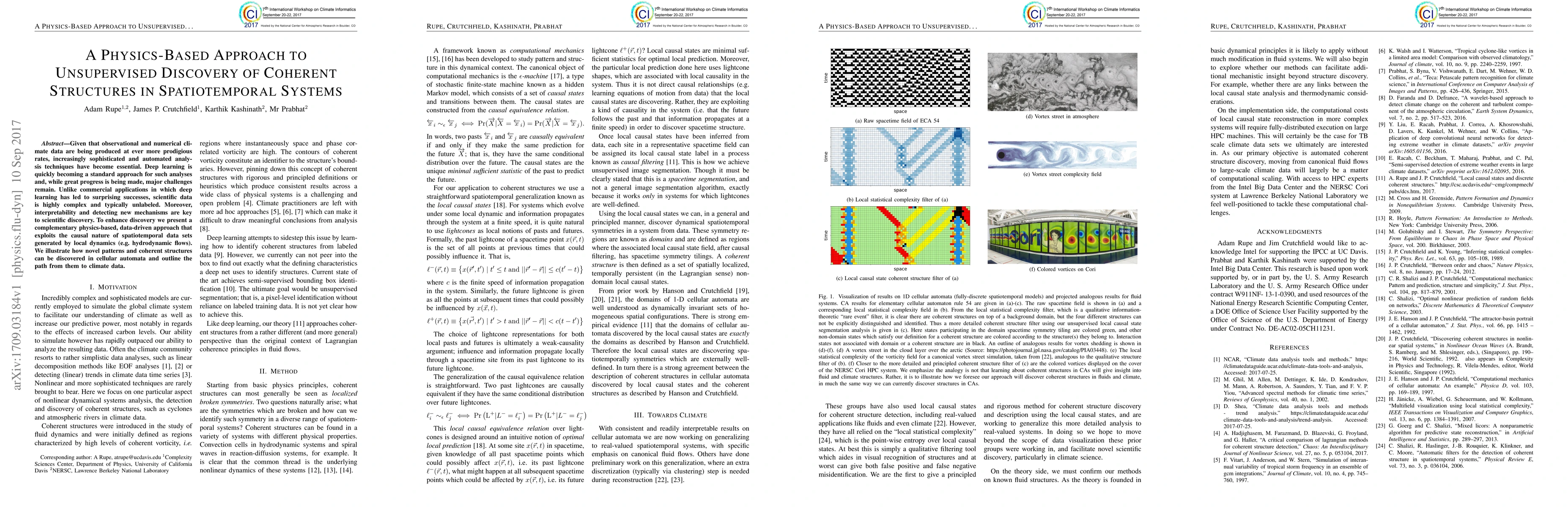 Given that observational and numerical climate data are being produced at ever more prodigious rates, increasingly sophisticated and automated analysis techniques have become essential. Deep learning is quickly becoming a standard approach for such analyses and, while great progress is being made, major challenges remain. Unlike commercial applications in which deep learning has led to surprising successes, scientific data is highly complex and typically unlabeled. Moreover, interpretability and detecting new mechanisms are key to scientific discovery. To enhance discovery we present a complementary physics-based, data-driven approach that exploits the causal nature of spatiotemporal data sets generated by local dynamics (e.g. hydrodynamic flows). We illustrate how novel patterns and coherent structures can be discovered in cellular automata and outline the path from them to climate data.