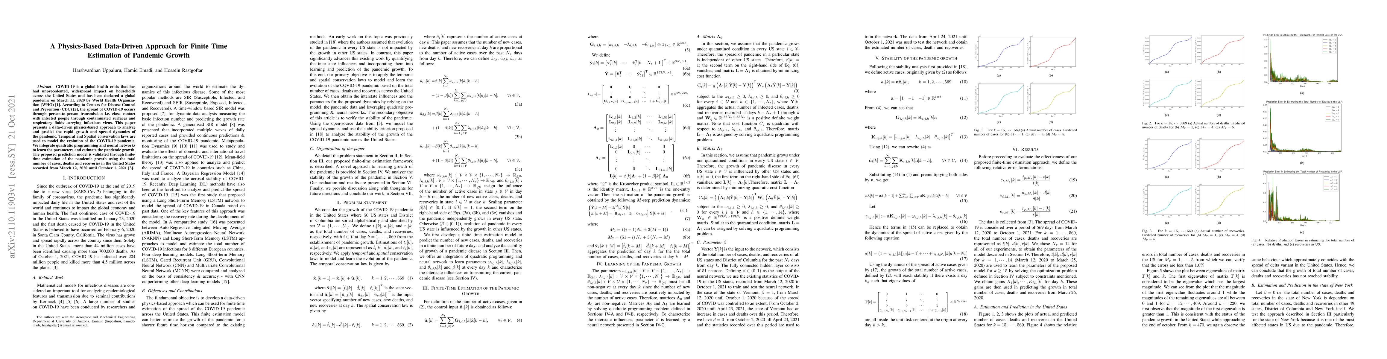 COVID-19 is a global health crisis that has had unprecedented, widespread impact on households across the United States and has been declared a global pandemic on March 11, 2020 by World Health Organization (WHO) [1]. According to Centers for Disease Control and Prevention (CDC) [2], the spread of COVID-19 occurs through person-to-person transmission i.e. close contact with infected people through contaminated surfaces and respiratory fluids carrying infectious virus. This paper presents a data-driven physics-based approach to analyze and predict the rapid growth and spread dynamics of the pandemic. Temporal and Spatial conservation laws are used to model the evolution of the COVID-19 pandemic. We integrate quadratic programming and neural networks to learn the parameters and estimate the pandemic growth. The proposed prediction model is validated through finite time estimation of the pandemic growth using the total number of cases, deaths and recoveries in the United States recorded from March 12, 2020 until October 1, 2021 [3].
