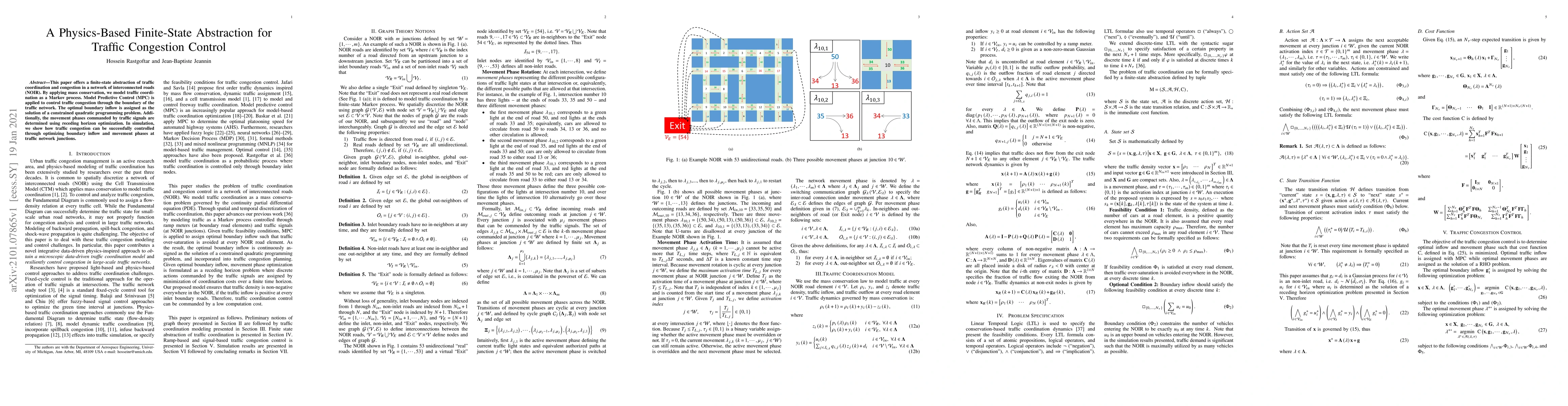 This paper proposes a physics-based finite-state abstraction for traffic congestion control using mass conservation and Model Predictive Control (MPC). It optimizes boundary inflow and traffic signal phases to manage congestion effectively in simulations.