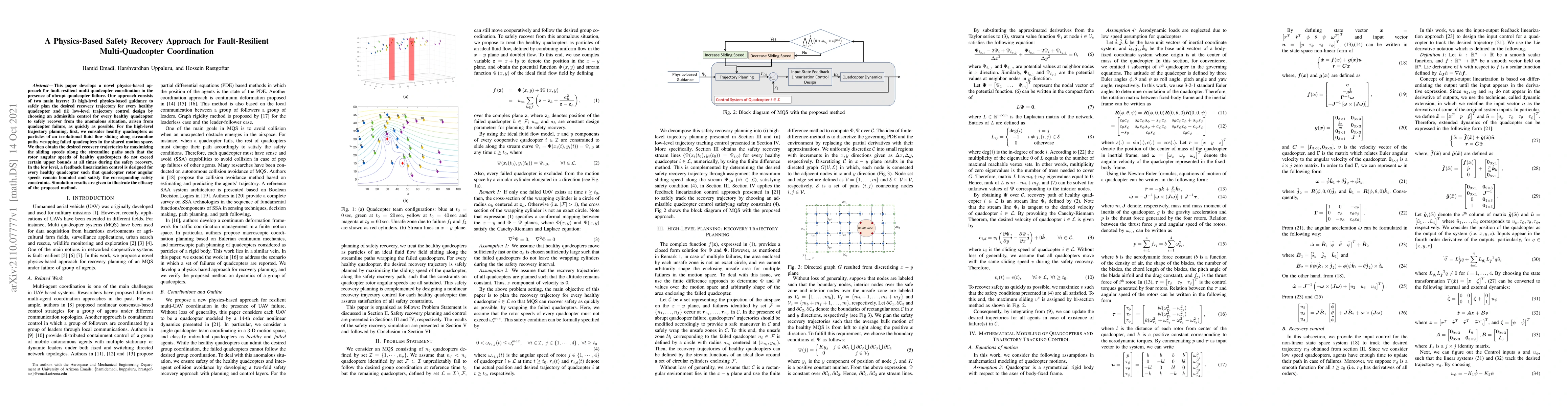 A new approach for safely recovering multi-quadcopters from failure is proposed, using physics-based guidance to plan recovery trajectories and feedback linearization control to ensure safe operation of healthy quads.