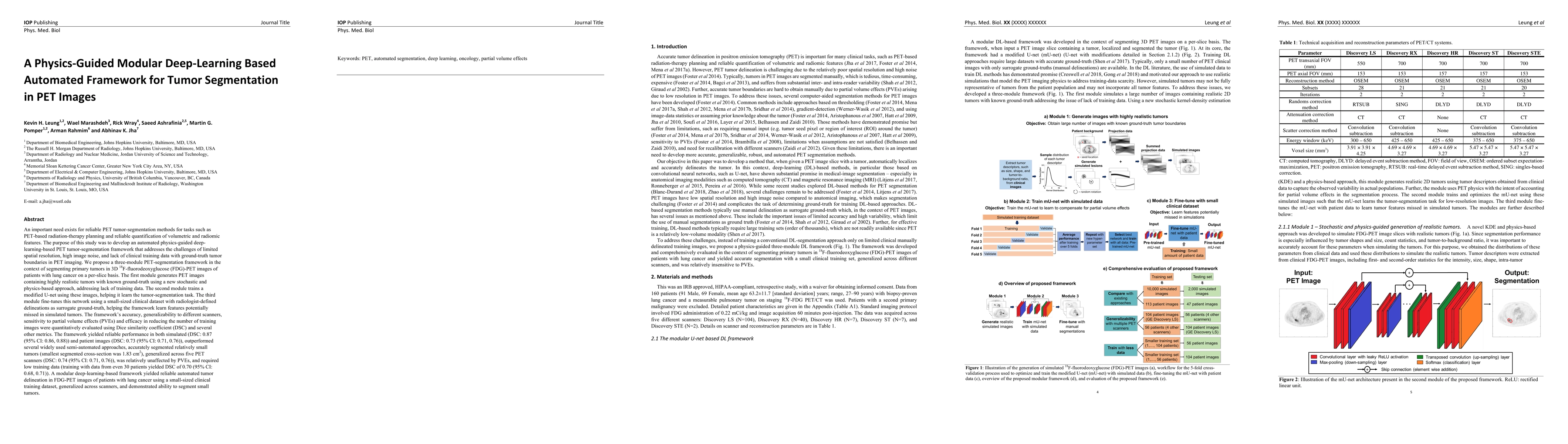 This study developed a physics-guided modular deep-learning framework for PET tumor segmentation, addressing data limitations and high image noise. The framework achieved reliable segmentation performance across different scanners and with minimal training data, outperforming semi-automated methods.