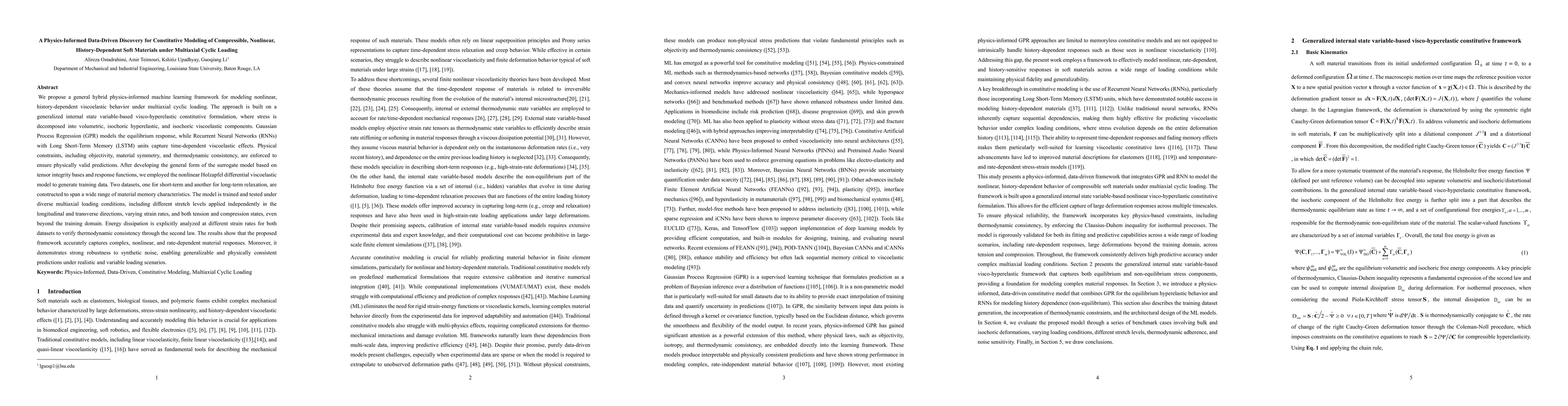 This research introduces a hybrid physics-informed machine learning framework for modeling complex, nonlinear, and rate-dependent behavior of soft materials under various loading conditions. The method combines Gaussian Process Regression for equilibrium response and Recurrent Neural Networks with LSTM units for time-dependent effects, while ensuring physical validity through constraints like objectivity, symmetry, and thermodynamic consistency. The model demonstrates accuracy, robustness, and generalizability across diverse datasets and loading scenarios.