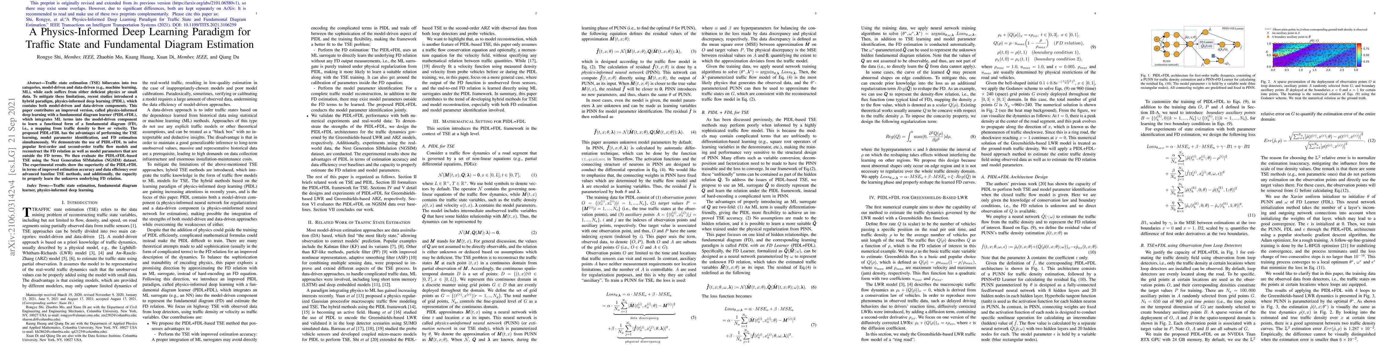 This paper proposes an improved physics-informed deep learning paradigm, PIDL+FDL, to simultaneously estimate traffic state, identify model parameters, and learn fundamental diagram relations. Experimental results on the NGSIM dataset demonstrate its superior accuracy and data efficiency compared to advanced baseline methods.