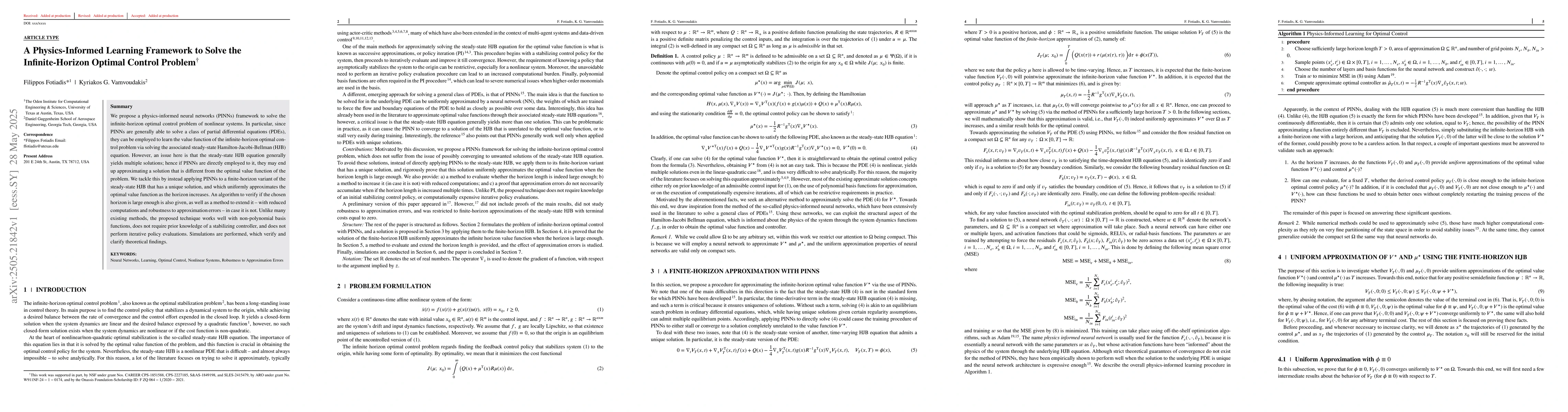 Researchers propose a physics-informed neural networks framework to solve infinite-horizon optimal control problems in nonlinear systems, achieving unique solutions without prior knowledge of stabilizing controllers or iterative policy evaluations.
