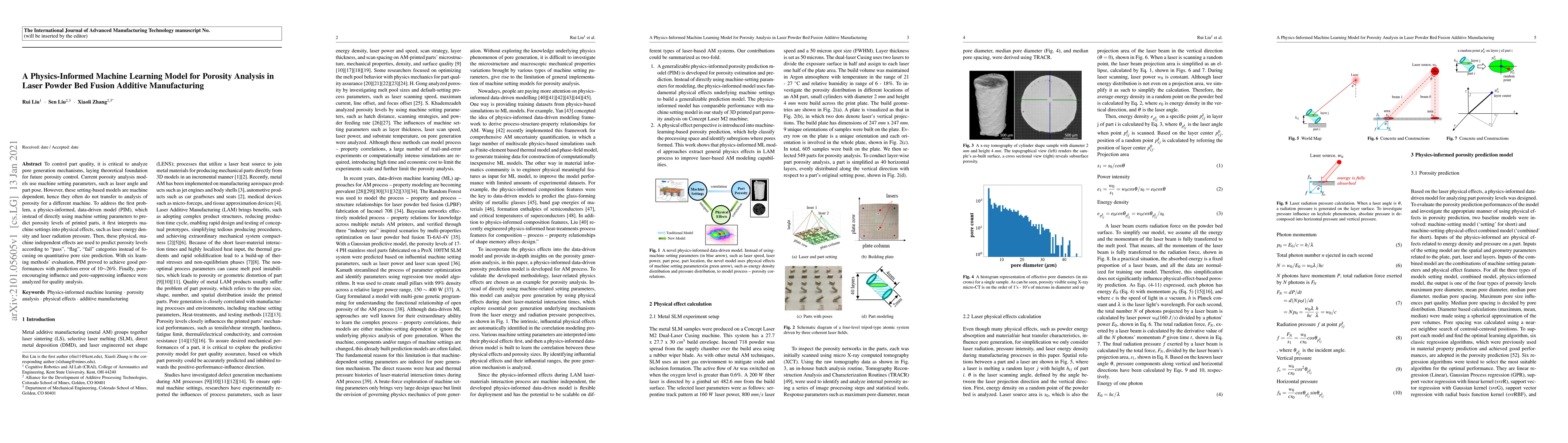 To control part quality, it is critical to analyze pore generation mechanisms, laying theoretical foundation for future porosity control. Current porosity analysis models use machine setting parameters, such as laser angle and part pose. However, these setting-based models are machine dependent, hence they often do not transfer to analysis of porosity for a different machine. To address the first problem, a physics-informed, data-driven model (PIM), which instead of directly using machine setting parameters to predict porosity levels of printed parts, it first interprets machine settings into physical effects, such as laser energy density and laser radiation pressure. Then, these physical, machine independent effects are used to predict porosity levels according to pass, flag, fail categories instead of focusing on quantitative pore size prediction. With six learning methods evaluation, PIM proved to achieve good performances with prediction error of 10$\sim$26%. Finally, pore-encouraging influence and pore-suppressing influence were analyzed for quality analysis.