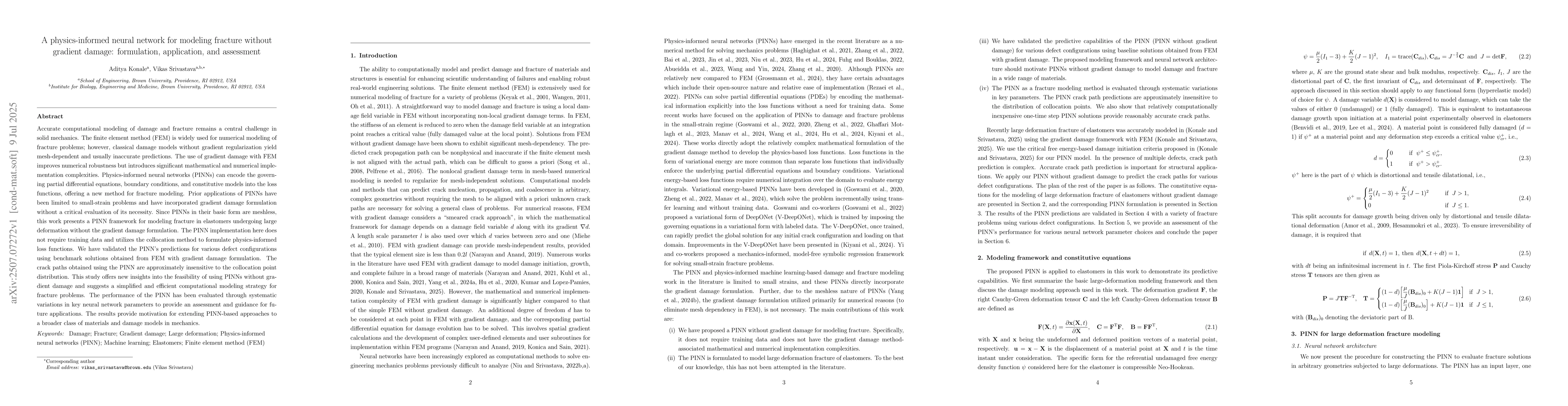 Accurate computational modeling of damage and fracture remains a central challenge in solid mechanics. The finite element method (FEM) is widely used for numerical modeling of fracture problems; however, classical damage models without gradient regularization yield mesh-dependent and usually inaccurate predictions. The use of gradient damage with FEM improves numerical robustness but introduces significant mathematical and numerical implementation complexities. Physics-informed neural networks (PINNs) can encode the governing partial differential equations, boundary conditions, and constitutive models into the loss functions, offering a new method for fracture modeling. Prior applications of PINNs have been limited to small-strain problems and have incorporated gradient damage formulation without a critical evaluation of its necessity. Since PINNs in their basic form are meshless, this work presents a PINN framework for modeling fracture in elastomers undergoing large deformation without the gradient damage formulation. The PINN implementation here does not require training data and utilizes the collocation method to formulate physics-informed loss functions. We have validated the PINN's predictions for various defect configurations using benchmark solutions obtained from FEM with gradient damage formulation. The crack paths obtained using the PINN are approximately insensitive to the collocation point distribution. This study offers new insights into the feasibility of using PINNs without gradient damage and suggests a simplified and efficient computational modeling strategy for fracture problems. The performance of the PINN has been evaluated through systematic variations in key neural network parameters to provide guidance for future applications. The results provide motivation for extending PINN-based approaches to a broader class of materials and damage models in mechanics.