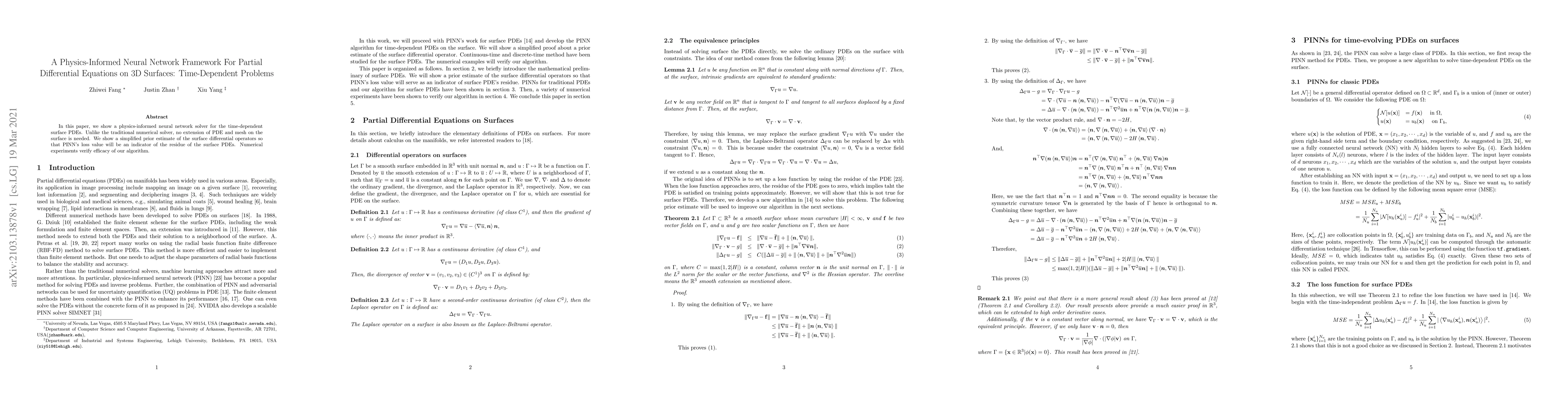 This paper presents a physics-informed neural network (PINN) framework to solve time-dependent partial differential equations on 3D surfaces without requiring PDE extensions or meshing. The method uses a simplified prior estimate of surface differential operators, and numerical experiments confirm its effectiveness.