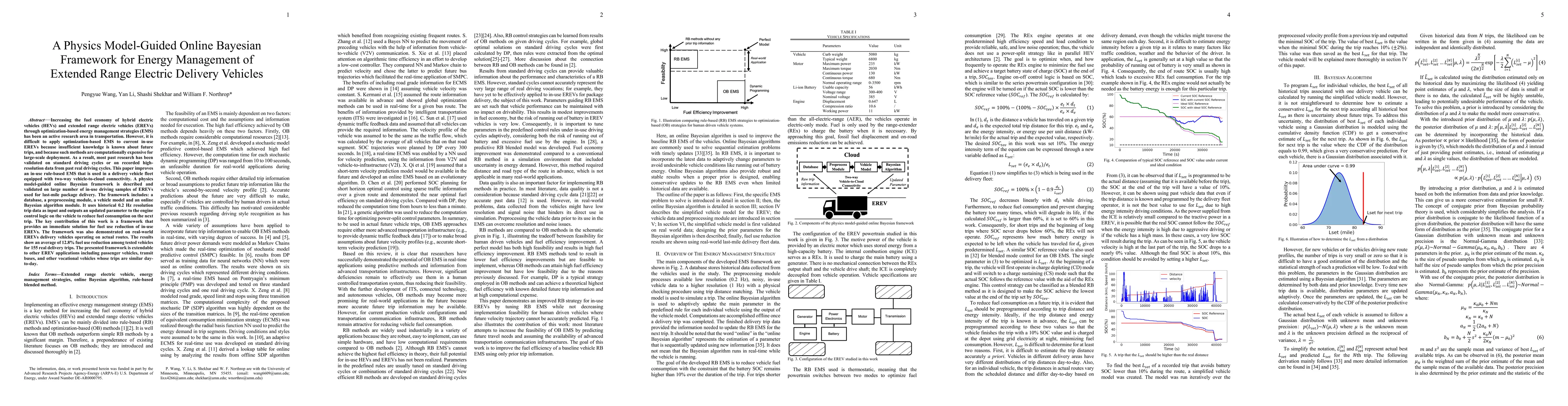 This paper proposes a physics model-guided online Bayesian framework to optimize energy management in extended range electric delivery vehicles, achieving a 12.8% average fuel use reduction. The framework updates engine control logic based on historical trip data, providing an immediate solution for in-use vehicles.