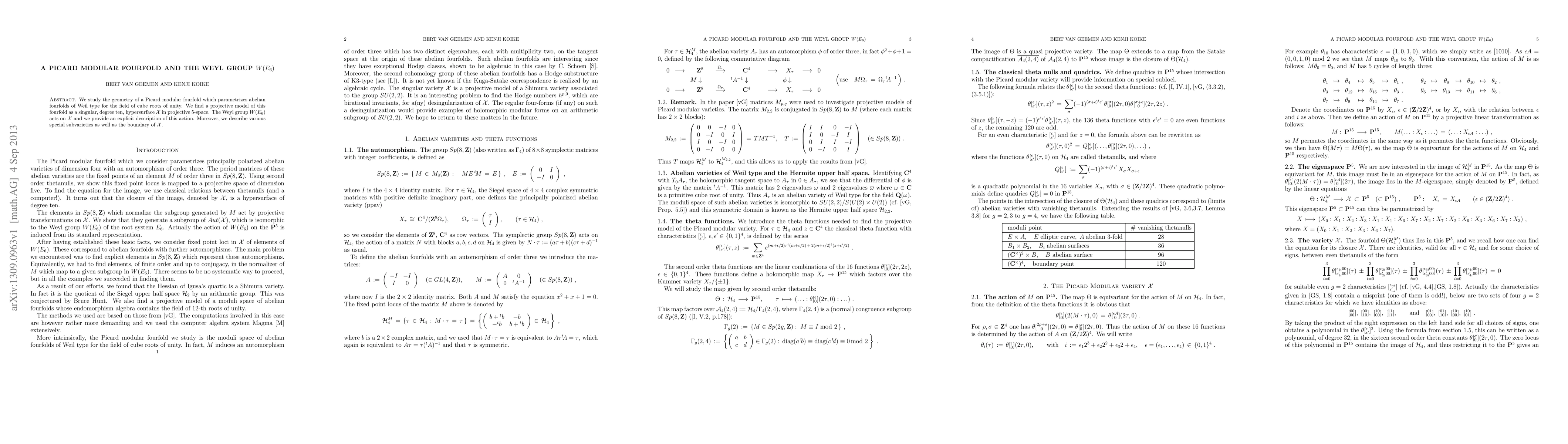 Researchers found a projective model of a Picard modular fourfold as a degree ten hypersurface in 5-space, which is acted upon by the Weyl group W(E_6) and has various special subvarieties.