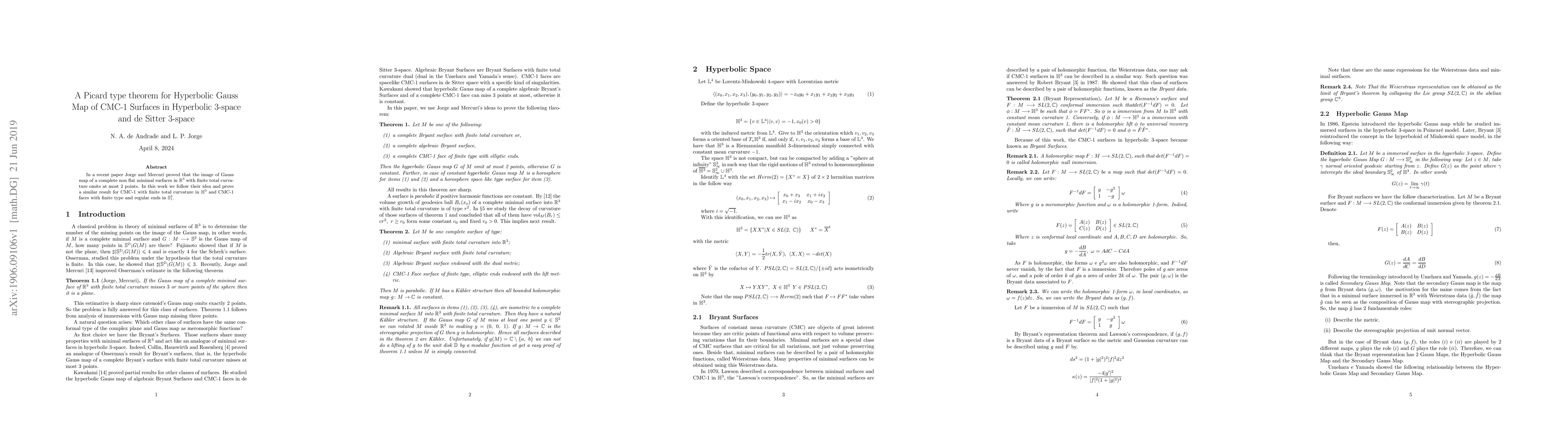 In a recent paper Jorge and Mercuri proved that the image of Gauss map of a complete non flat minimal surfaces in R3 with finite total curvature omits at most 2 points. In this work we follow their idea and prove 3a similar result for CMC-1 with finite total curvature in H and CMC-1 faces with finite type and regular ends in S31.