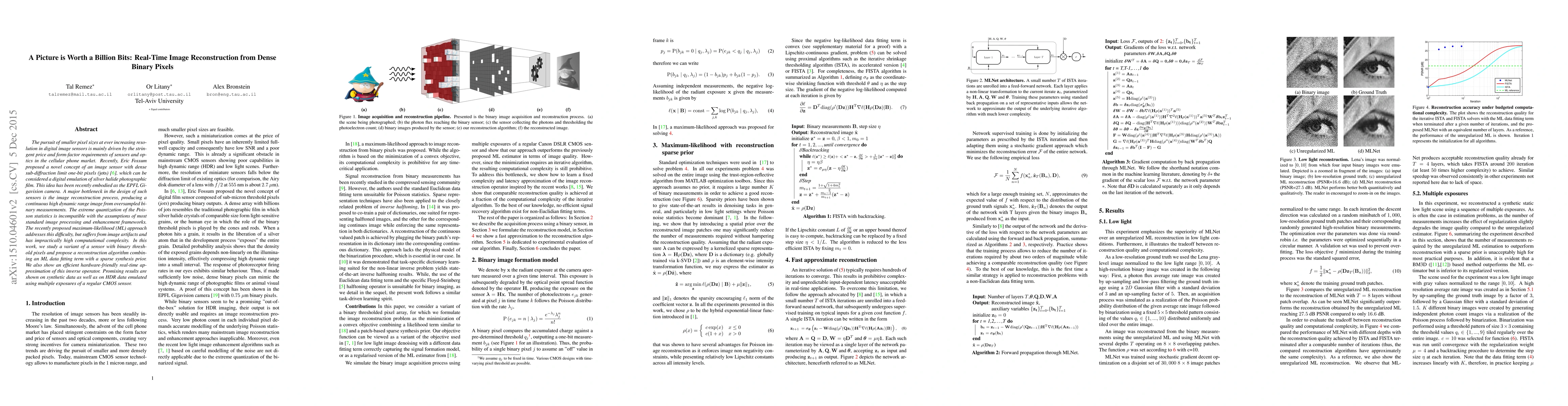 The pursuit of smaller pixel sizes at ever increasing resolution in digital image sensors is mainly driven by the stringent price and form-factor requirements of sensors and optics in the cellular phone market. Recently, Eric Fossum proposed a novel concept of an image sensor with dense sub-diffraction limit one-bit pixels jots, which can be considered a digital emulation of silver halide photographic film. This idea has been recently embodied as the EPFL Gigavision camera. A major bottleneck in the design of such sensors is the image reconstruction process, producing a continuous high dynamic range image from oversampled binary measurements. The extreme quantization of the Poisson statistics is incompatible with the assumptions of most standard image processing and enhancement frameworks. The recently proposed maximum-likelihood (ML) approach addresses this difficulty, but suffers from image artifacts and has impractically high computational complexity. In this work, we study a variant of a sensor with binary threshold pixels and propose a reconstruction algorithm combining an ML data fitting term with a sparse synthesis prior. We also show an efficient hardware-friendly real-time approximation of this inverse operator.Promising results are shown on synthetic data as well as on HDR data emulated using multiple exposures of a regular CMOS sensor.