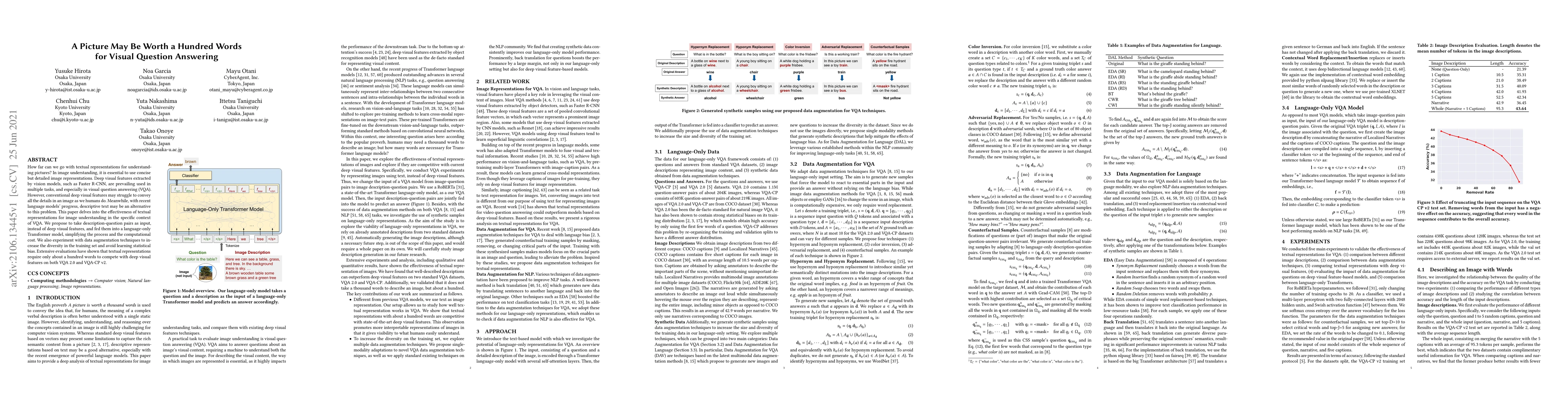 How far can we go with textual representations for understanding pictures? In image understanding, it is essential to use concise but detailed image representations. Deep visual features extracted by vision models, such as Faster R-CNN, are prevailing used in multiple tasks, and especially in visual question answering (VQA). However, conventional deep visual features may struggle to convey all the details in an image as we humans do. Meanwhile, with recent language models' progress, descriptive text may be an alternative to this problem. This paper delves into the effectiveness of textual representations for image understanding in the specific context of VQA. We propose to take description-question pairs as input, instead of deep visual features, and fed them into a language-only Transformer model, simplifying the process and the computational cost. We also experiment with data augmentation techniques to increase the diversity in the training set and avoid learning statistical bias. Extensive evaluations have shown that textual representations require only about a hundred words to compete with deep visual features on both VQA 2.0 and VQA-CP v2.