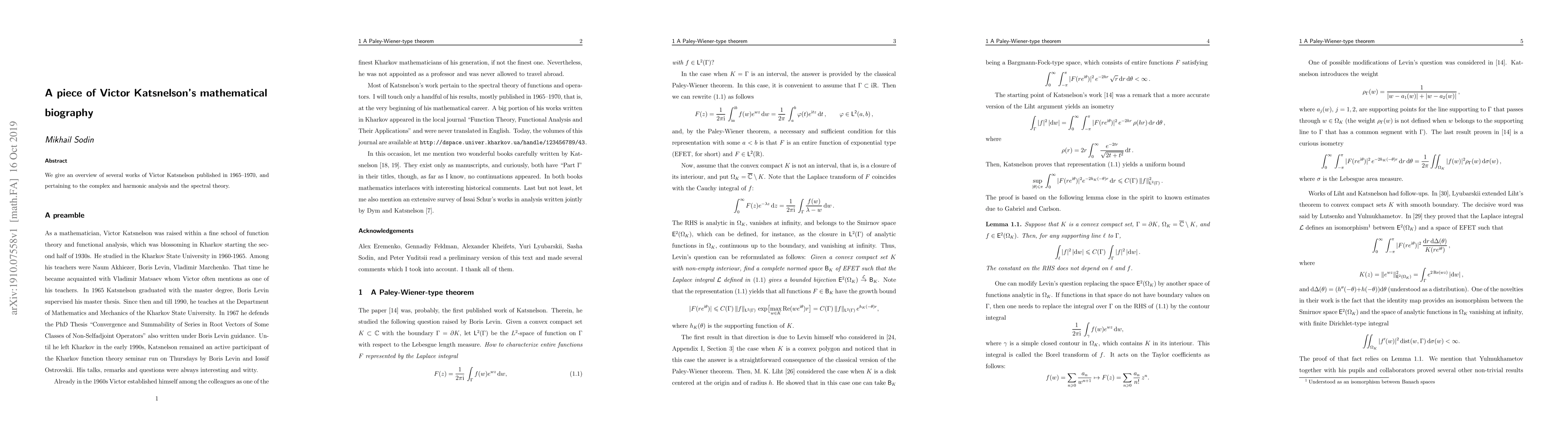 We give an overview of several works of Victor Katsnelson published in 1965--1970, and pertaining to the complex and harmonic analysis and the spectral theory.