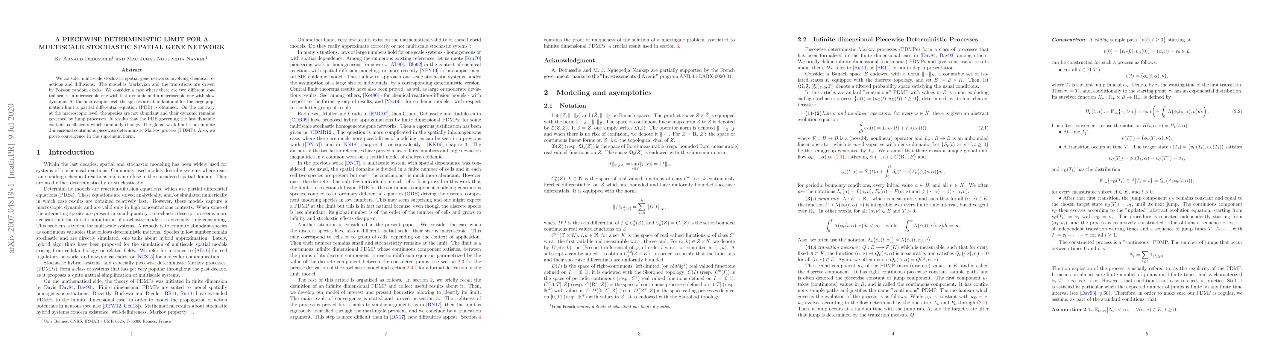 We consider multiscale stochastic spatial gene networks involving chemical reactions and diffusions. The model is Markovian and the transitions are driven by Poisson random clocks. We consider a case where there are two different spatial scales: a microscopic one with fast dynamic and a macroscopic one with slow dynamic. At the microscopic level, the species are abundant and for the large population limit a partial differential equation (PDE) is obtained. On the contrary at the macroscopic level, the species are not abundant and their dynamic remains governed by jump processes. It results that the PDE governing the fast dynamic contains coefficients which randomly change. The global weak limit is an infinite dimensional continuous piecewise deterministic Markov process (PDMP). Also, we prove convergence in the supremum norm.