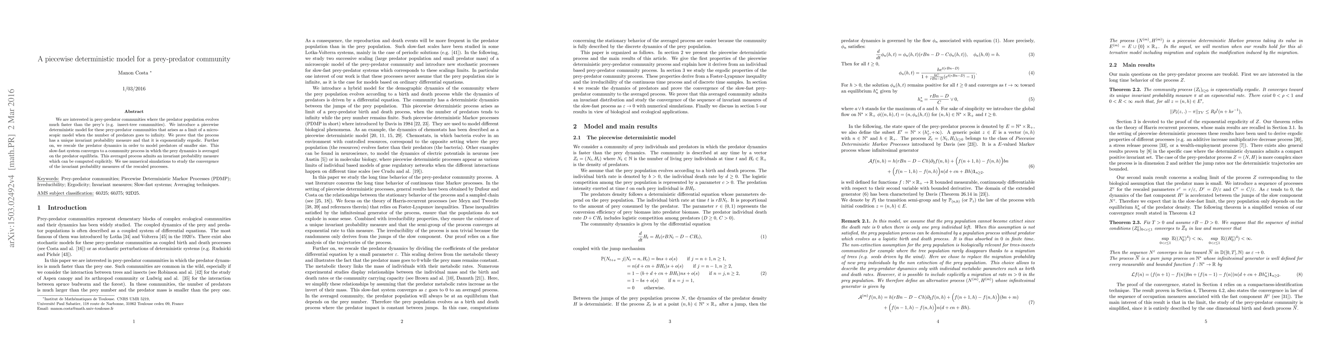 This paper develops a piecewise deterministic model for prey-predator communities where the predator evolves much faster than the prey. It proves the model's unique invariant probability measure and exponential ergodicity, and rescales predator dynamics to study smaller predators, showing convergence to an averaged prey process with an explicitly computable invariant measure.