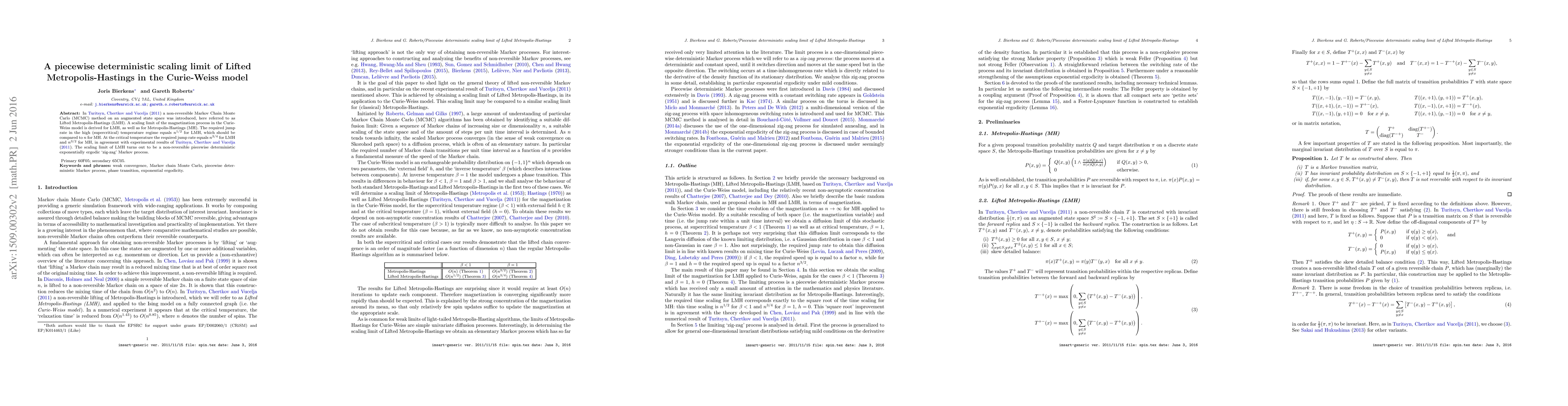 In Turitsyn, Chertkov, Vucelja (2011) a non-reversible Markov Chain Monte Carlo (MCMC) method on an augmented state space was introduced, here referred to as Lifted Metropolis-Hastings (LMH). A scaling limit of the magnetization process in the Curie-Weiss model is derived for LMH, as well as for Metropolis-Hastings (MH). The required jump rate in the high (supercritical) temperature regime equals $n^{1/2}$ for LMH, which should be compared to $n$ for MH. At the critical temperature the required jump rate equals $n^{3/4}$ for LMH and $n^{3/2}$ for MH, in agreement with experimental results of Turitsyn, Chertkov, Vucelja (2011). The scaling limit of LMH turns out to be a non-reversible piecewise deterministic exponentially ergodic `zig-zag' Markov process.