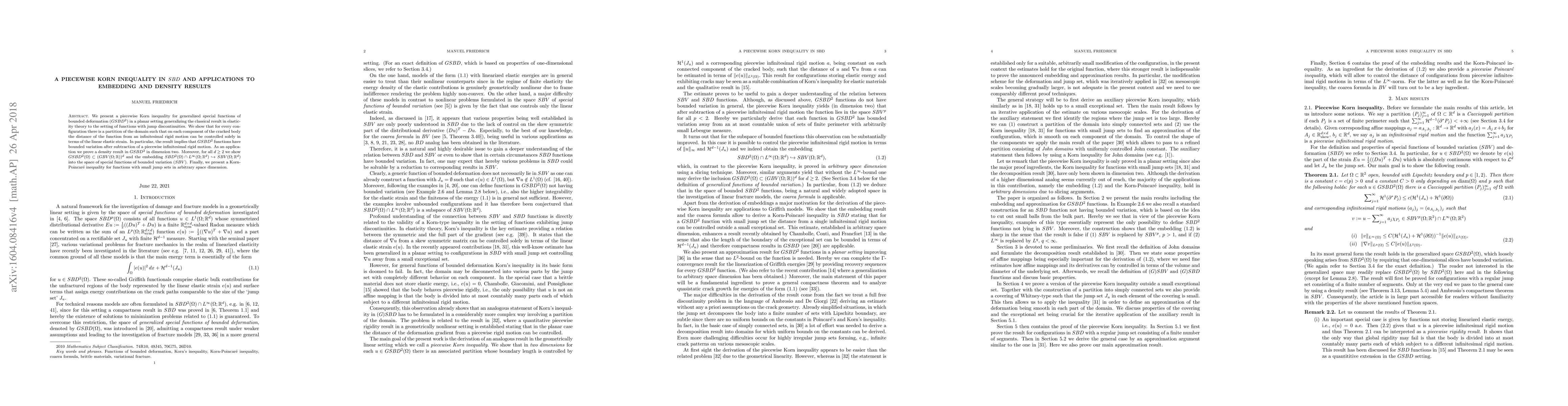 Researchers establish a piecewise Korn inequality for generalized special functions of bounded deformation in planar settings, allowing them to control the distance from rigid motion and prove density results, with implications for embedding and variation estimates in higher dimensions.