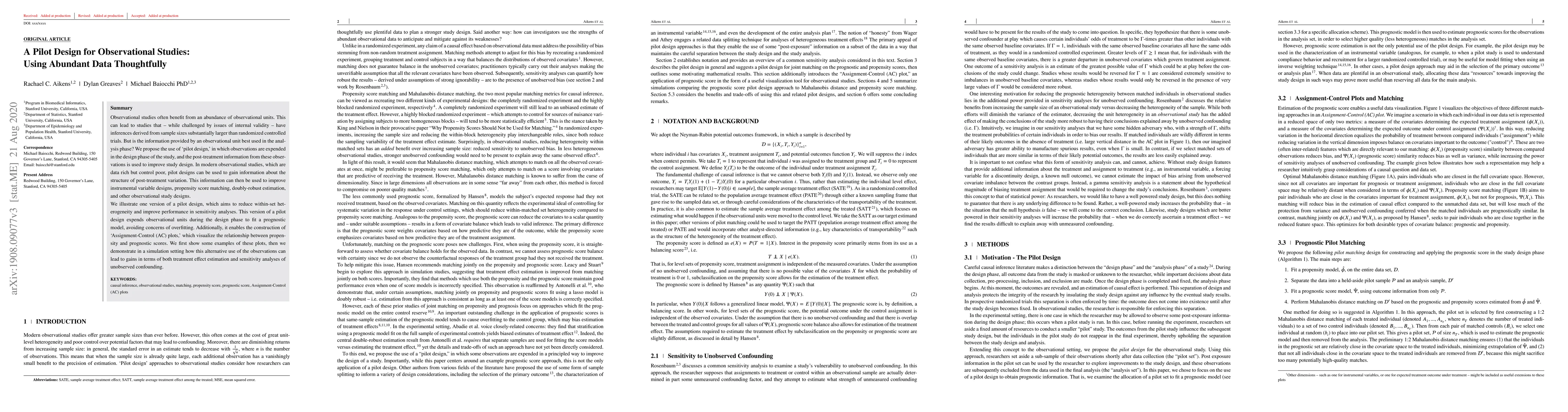 Observational studies often benefit from an abundance of observational units. This can lead to studies that -- while challenged by issues of internal validity -- have inferences derived from sample sizes substantially larger than randomized controlled trials. But is the information provided by an observational unit best used in the analysis phase? We propose the use of `pilot design,' in which observations are expended in the design phase of the study, and the post-treatment information from these observations is used to improve study design. In modern observational studies, which are data rich but control poor, pilot designs can be used to gain information about the structure of post-treatment variation. This information can then be used to improve instrumental variable designs, propensity score matching, doubly-robust estimation, and other observational study designs. We illustrate one version of a pilot design, which aims to reduce within-set heterogeneity and improve performance in sensitivity analyses. This version of a pilot design expends observational units during the design phase to fit a prognostic model, avoiding concerns of overfitting. Additionally, it enables the construction of `Assignment-Control (AC) plots,' which visualize the relationship between propensity and prognostic scores. We first show some examples of these plots, then we demonstrate in a simulation setting how this alternative use of the observations can lead to gains in terms of both treatment effect estimation and sensitivity analyses of unobserved confounding.